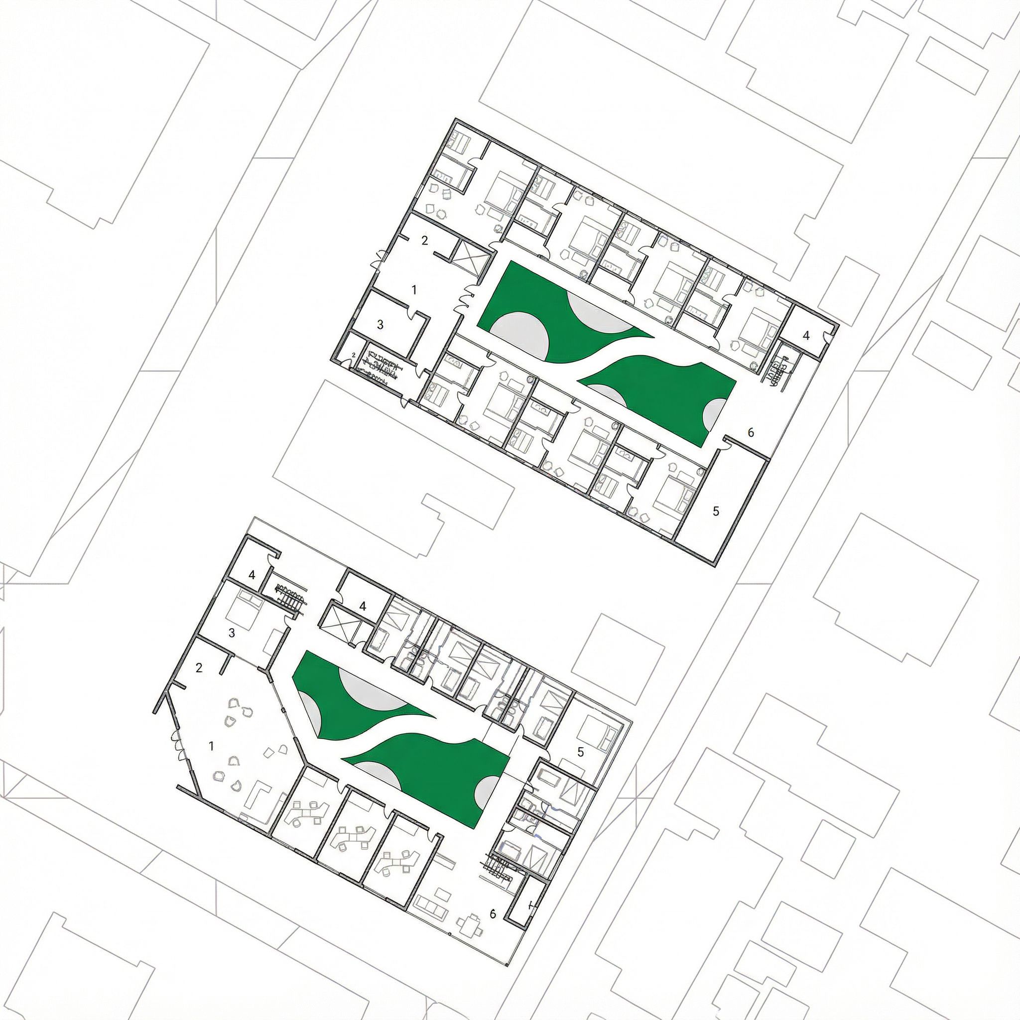 Promptarchitectural floor plan, render this drawing into technical drawing, Create a high-resolution architectural floor plan that keeps exactly the same geometry, walls, doors, windows, and unit layouts as the original Revit-exported plan. Do not modify the building shape or room proportions. Maintain the black lineweight outline style, white background, and minimal shading consistent with the rest of the drawings. Add missing interior layouts and furniture only inside the residential units, keeping them simple and architectural: – studio units: bed, small sofa, kitchenette, table + two chairs – one-bedroom units: bed, wardrobe, small living arrangement, dining table – two-bedroom units: two beds, minimal living room setup Everything must be light-line, monochrome, and consistent with the graphic language already present. Keep the existing annotations and room numbers (1–7) untouched. Ensure symbols and furniture match a “Revit/AutoCAD” drawing language — clean, thin lineweights, no textures. Site context should remain minimal with light-grey outlines of surrounding buildings and roads. Final image should feel like a clean architectural CD-set drawing: precise, readable, technical, and identical in style to the rest of the project sheets., keep exact camera angle, including furniture, dimension annotations, high quality, professional, detailed scene
