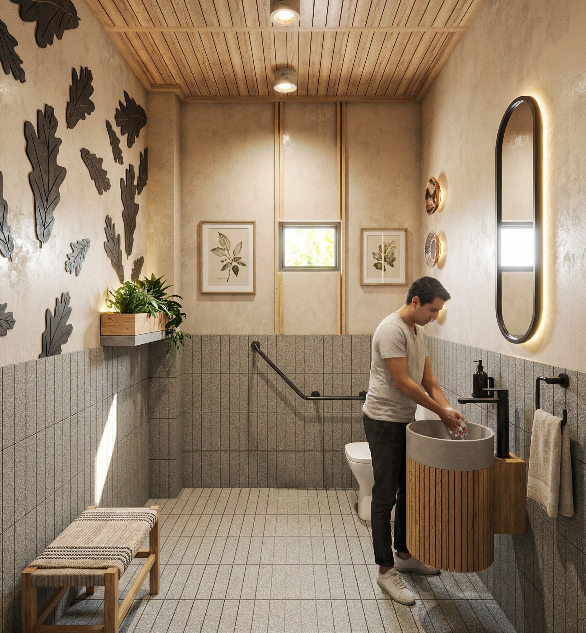 A high-design public restroom located in Plaza Paseo Rocaval, in San Cristóbal de las Casas, Chiapas. The space was designed to convey an organic, natural, and contemporary aesthetic, with a sophisticated, warm, and elegant feel. The project features 7 x 30 cm ceramic tile flooring with a granite-like finish in gray, laid with perfectly aligned 3 mm grout lines. The walls are finished with wainscoting of the same ceramic tile up to a height of 1.20 m, and the remaining wall area is finished with Chukum-type plaster, featuring a natural texture and soft tones. The vanity unit is grooved, made of natural pine wood with visible grain and a matte finish. The sink is made of gray ceramic in a natural concrete-like color, with a matte black faucet. The mirror has a black metal frame, clean lines, and a contemporary design. The toilet is white with a minimalist design.Wall in front of the sink with painted leaves, planter in natural pine wood and base in gray natural concrete type, vertical natural pine wood views to the sides of the window, bathroom accessories in black, backlit mirror, ceiling in pine wood natural finish, light fixtures in marble natural stone type finish, the light should be scenic., keep exact camera angle