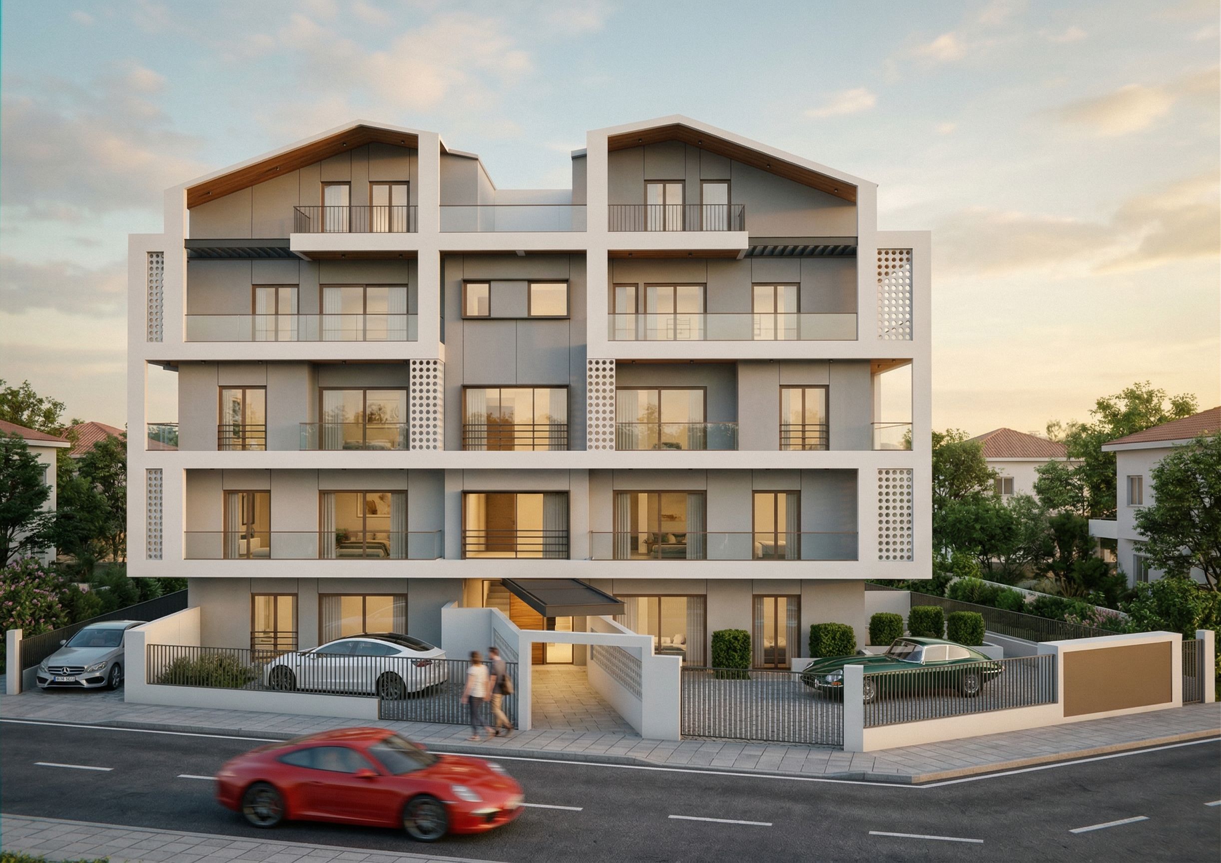 PromptModern block with large windows, materials such as concrete,plaster,metal, white clauster surrounded with greenery. Put at the left side in front of the right window a car . Also put at the left side of the building a car. Put at the right side in front of the big window a car and add besides this car a few bushes. Put in front of our building a road with a car., keep exact camera angle