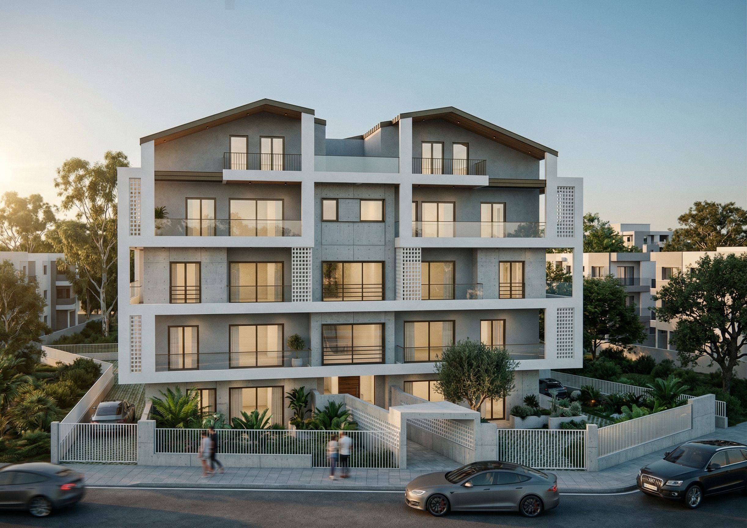 PromptModern block with large windows, materials such as concrete,plaster,metal, white clauster surrounded with greenery. , keep exact camera angle