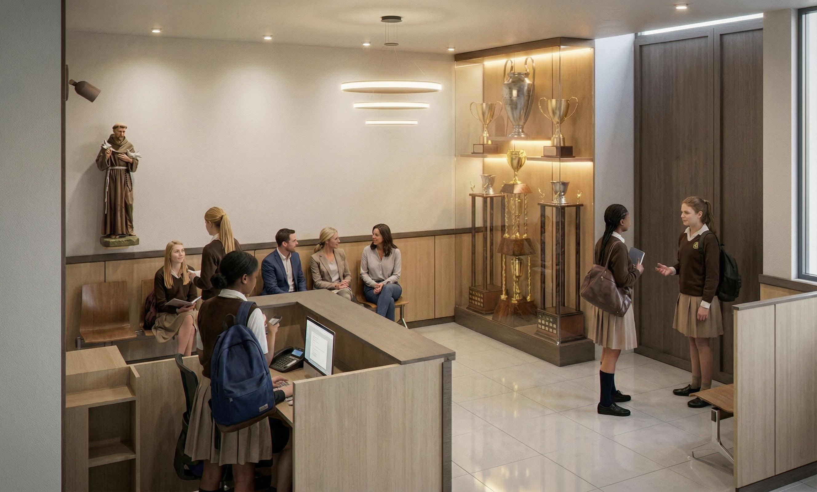 PromptCorrige, la niña no debe estar en el mueble de la recepción, ahí va la secretaria. El piso de porcelanato es mate. El santo de san francisco no va en esa pared, va al costado del mueble de la recepción, dobde pusiste esa estatua de madera plana. El uniforme de los niños es marrón con beige y es un colegio de solo mujeres, deben haber padres de familia en el hall. Lo demás está bien., keep exact camera angle