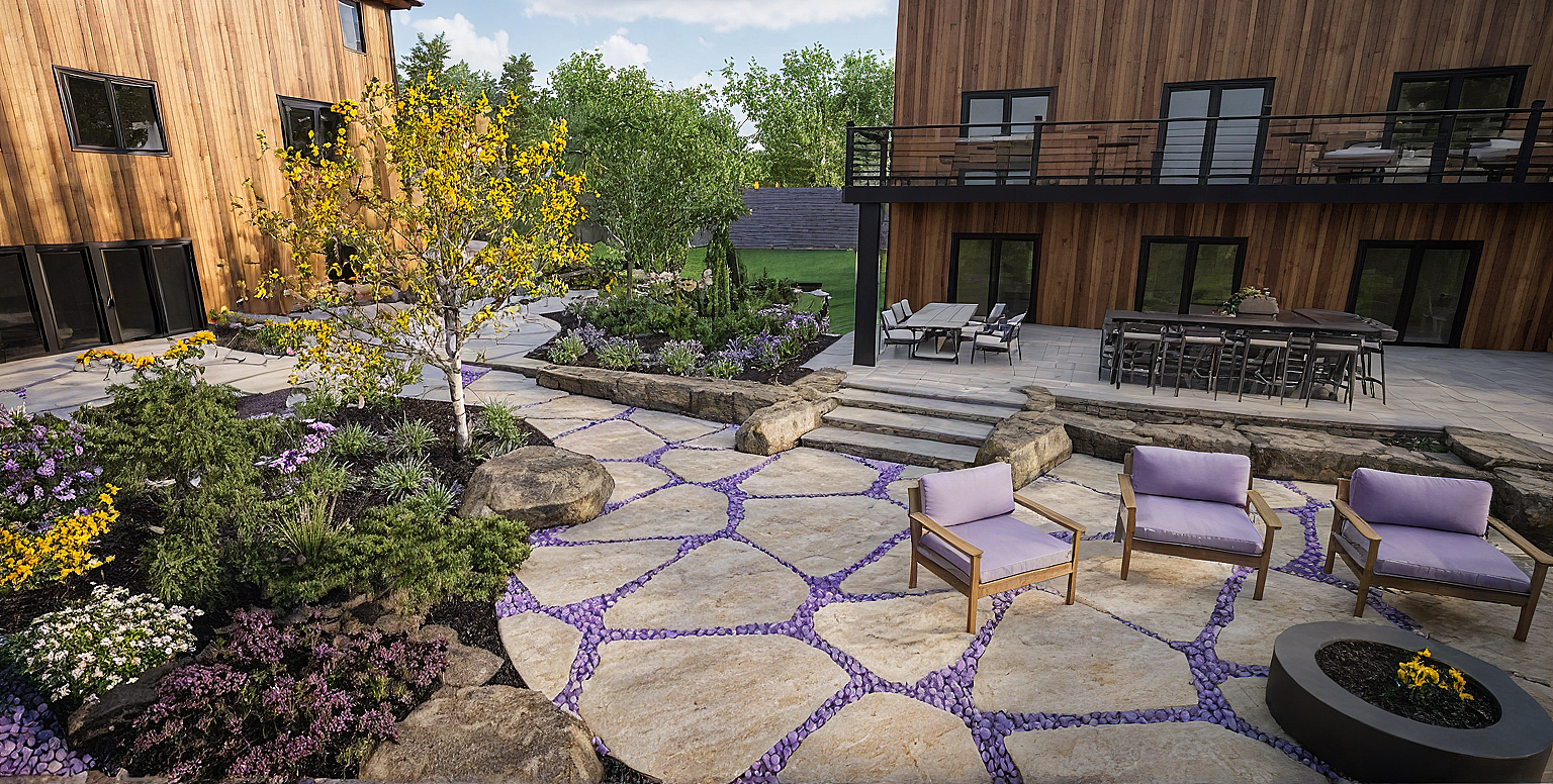 Promptteak siding, flagstone patio, lilac, birch trees, black-eyed susan, juniper, asters, landscaping