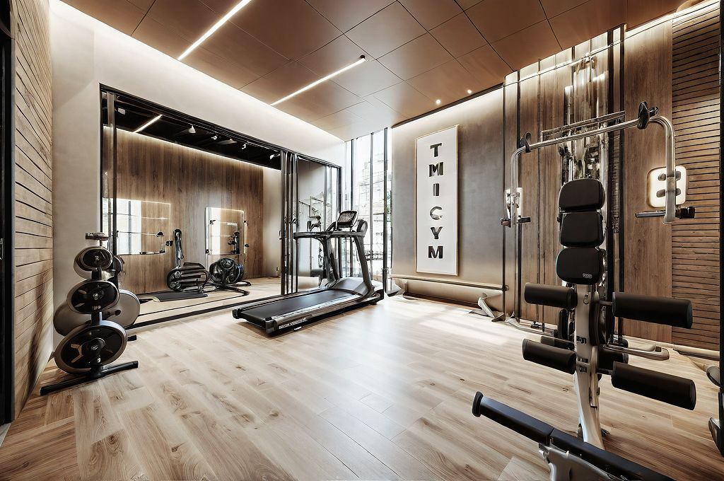 Prompta modern gym with open to exterior on the left, and mirros on the right, with leds on the roof