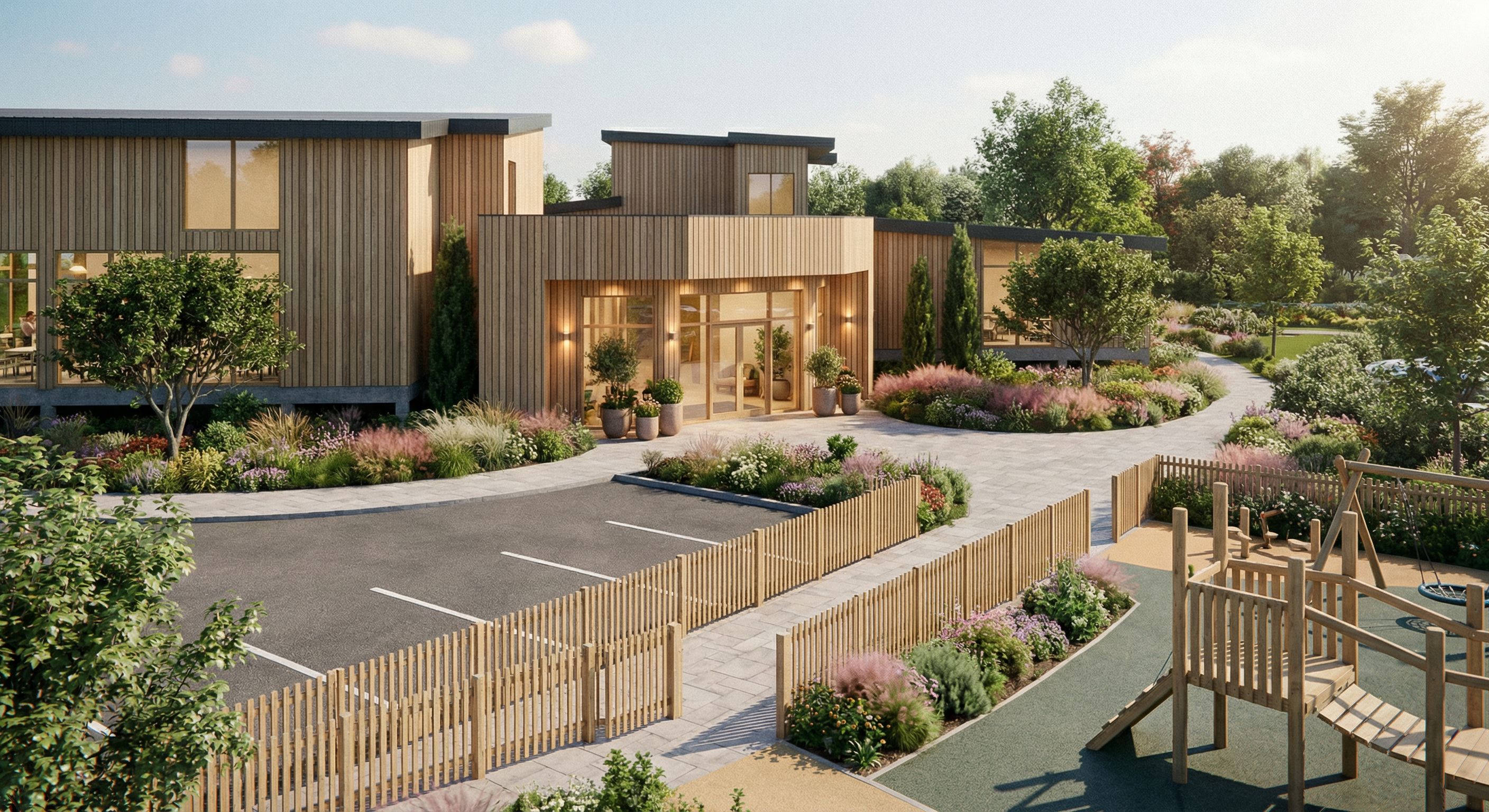 add more vegetation to the surrounding landscape.add a fence to seperate the carpark witht he pedestrian pathway. there is also a playground at the bottom of the image. this is my rehab building main entrance. make the entrance welcoming. clean minimalist style. the external cladding for the building is vertical accoya panels. mantain the form of the building, keep exact camera angle