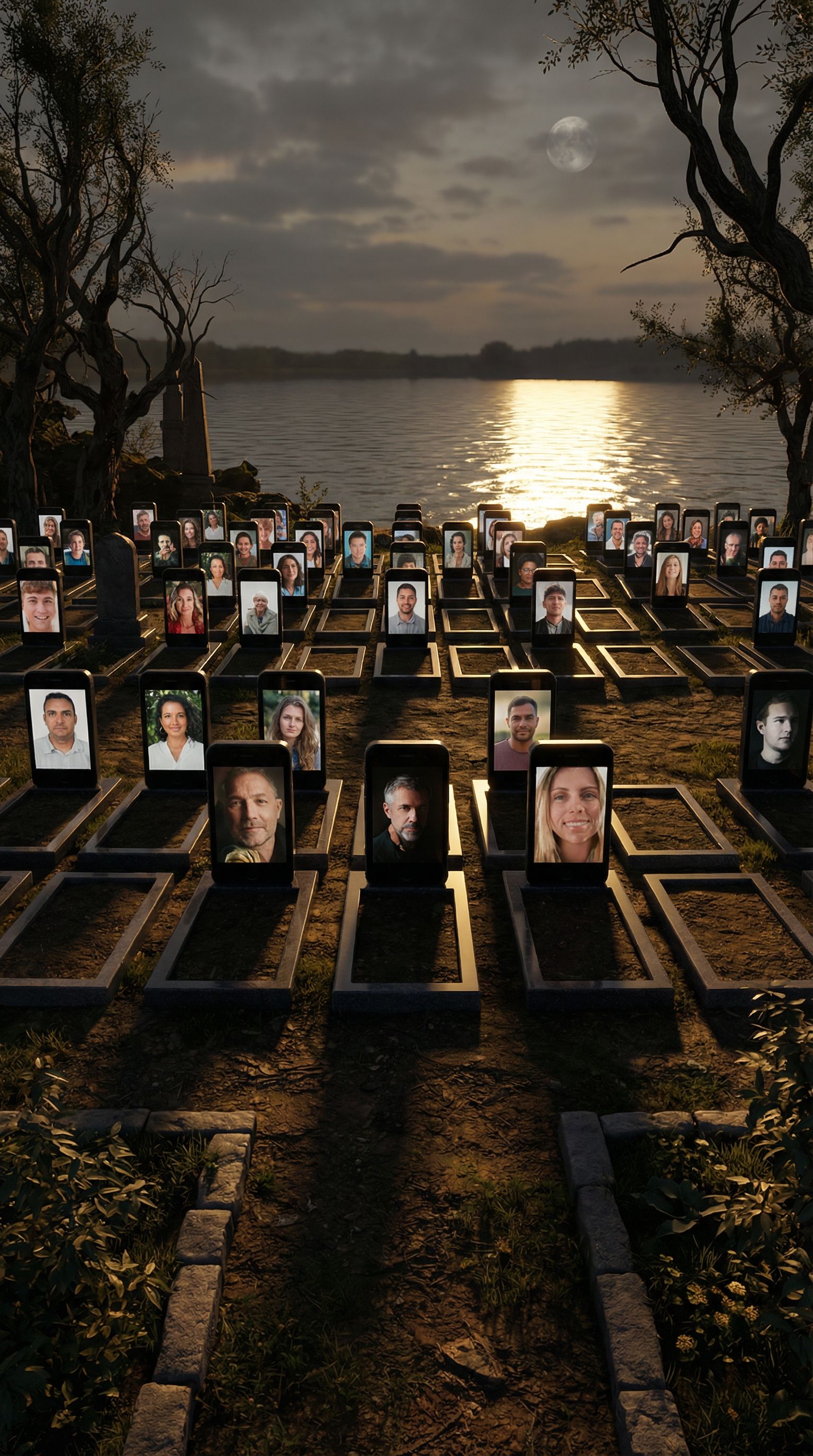 architectural exterior rendering, render this sketch into photorealistic rendering, Create an image like the sketch. There are many graves with cell phone-shaped headstones. The atmosphere is like that of a cemetery. The cell phone screens display close-ups of different people. The atmosphere is dark and gloomy. The moon dimly illuminates the scene. Behind the cemetery is a lake with moonlight reflecting on it. Insert 100 graves as described above and 20 empty graves without headstones., keep exact camera angle, golden hour warm lighting, including trees, high quality, professional, detailed scene