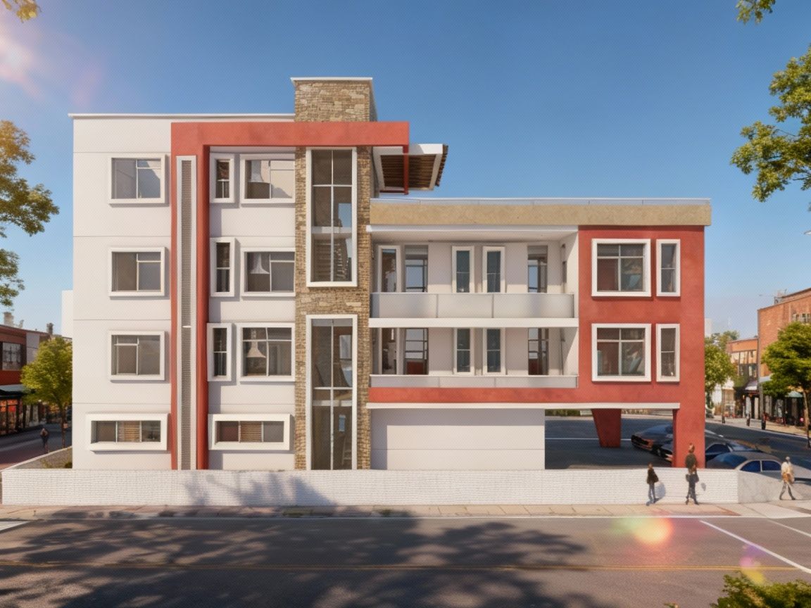 Promptmodern urban mixed-use(Commercial shops on ground floor and residential on uper floors) building in an urban developed neighbourhood. , keep exact camera angle
