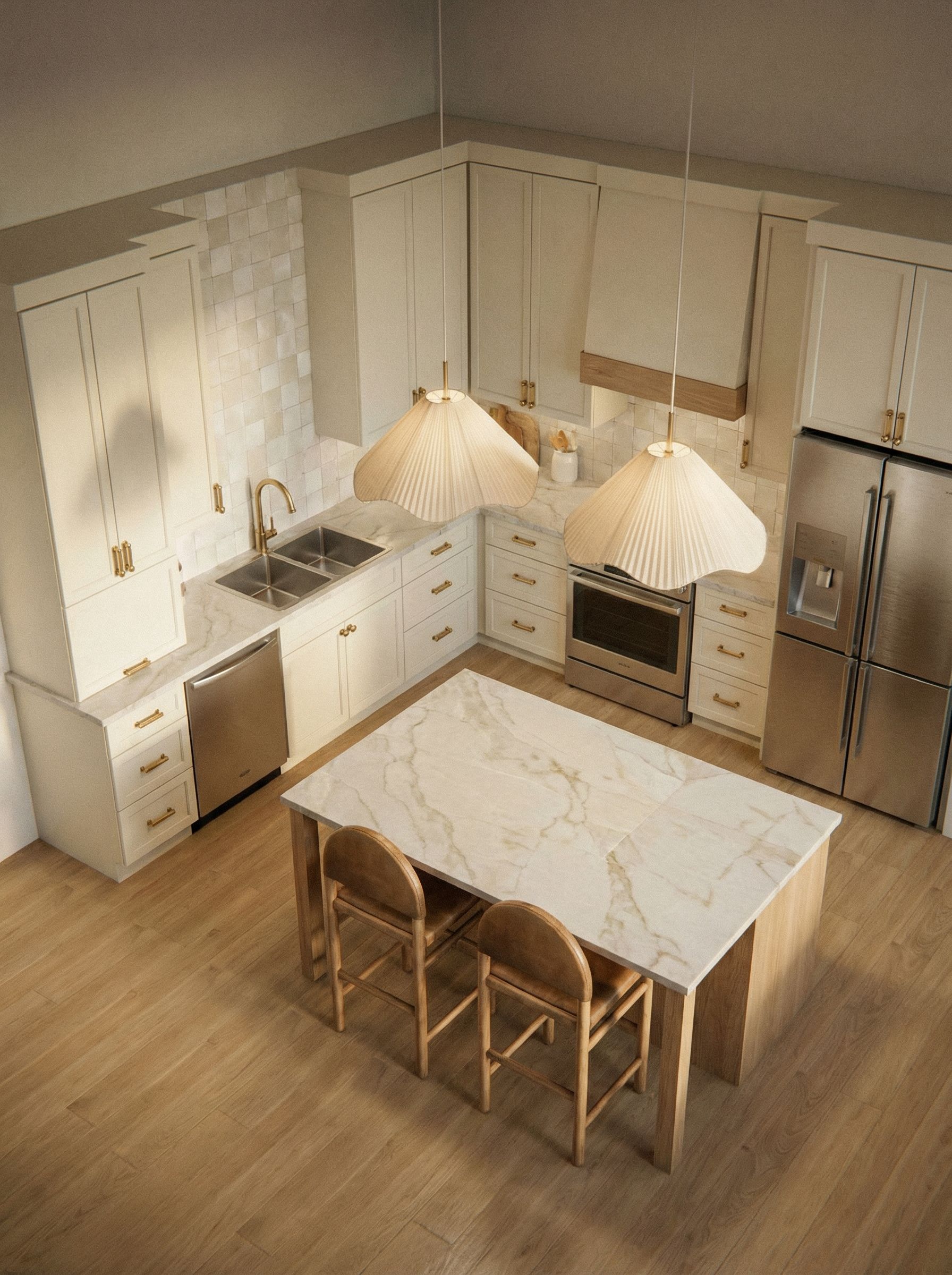 USET THE UPLOADED IMAGE TO CREATE A MORE REALISTIC RENDERING USING THE MATERIALS IN THE REFERENCE IMAGE. PLACE TWO OF THE PENDANTS IN THE REFERENCE IMAGE ABOVE THE ISLAND. USE THE BRASS HARDWARE FROM THE REFERENCE IMAGE ON THE CABINET DOORS AND DRAWERS. fINS A COUNTER HEIGHT STOOL THAT LOOOKS SIMILAR TO THE ONE IN THE REFERENCE IMAGE. TAJ MAHAL QUARTZITE COUNTER TOPS AND 4X4 OFF WHITE SELLIGE TILE BACKSPLASH TO CEILING. USE THE SAME PERSPECTIVE AS THE UPLOADED IMAGE FOR THE CAMERA ANGLE. ISLAND IS WHITE OAK., keep exact camera angle