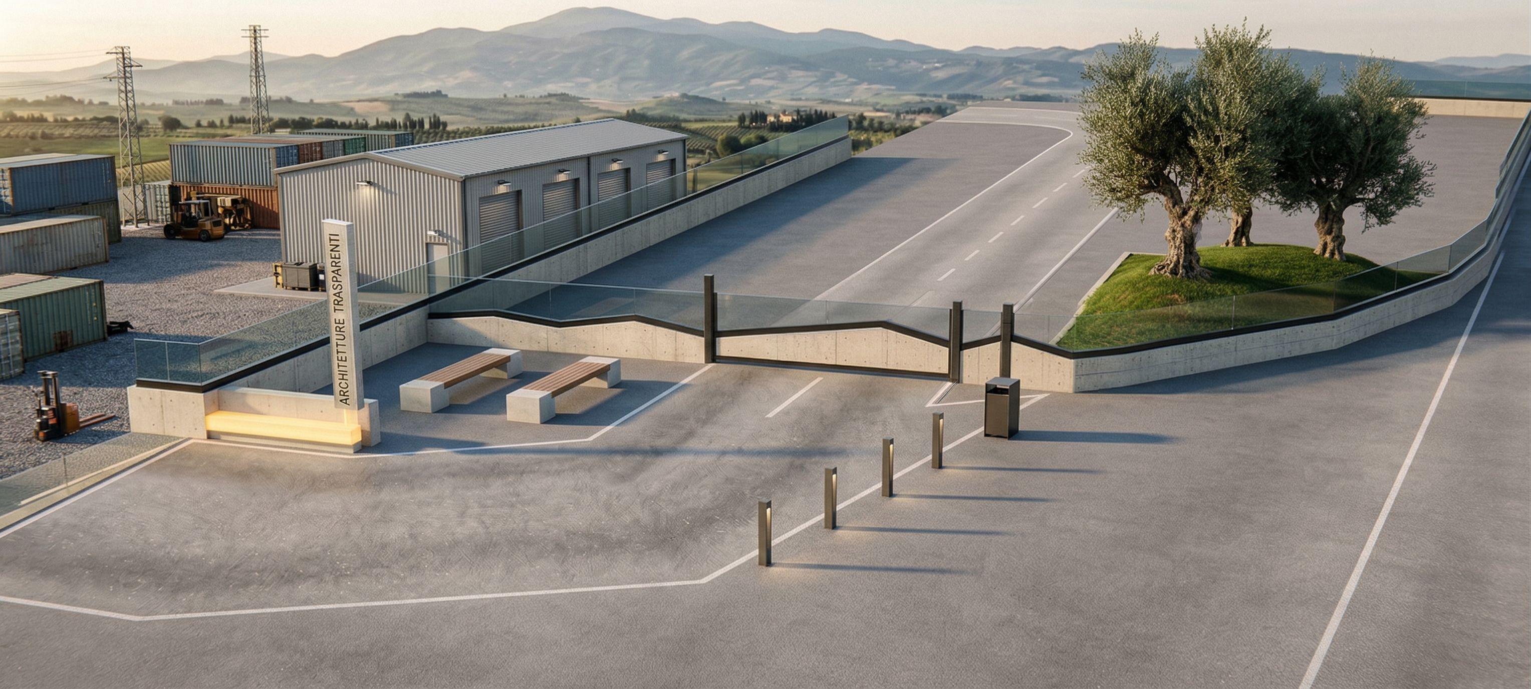 edit this base image. Replace the hilly type context indicated on the left side of the base image, with an industrial context with a shed adjacent to the concrete and glass wall on the left; replace the square grilled floor shown below with clear asphalt., keep exact camera angle