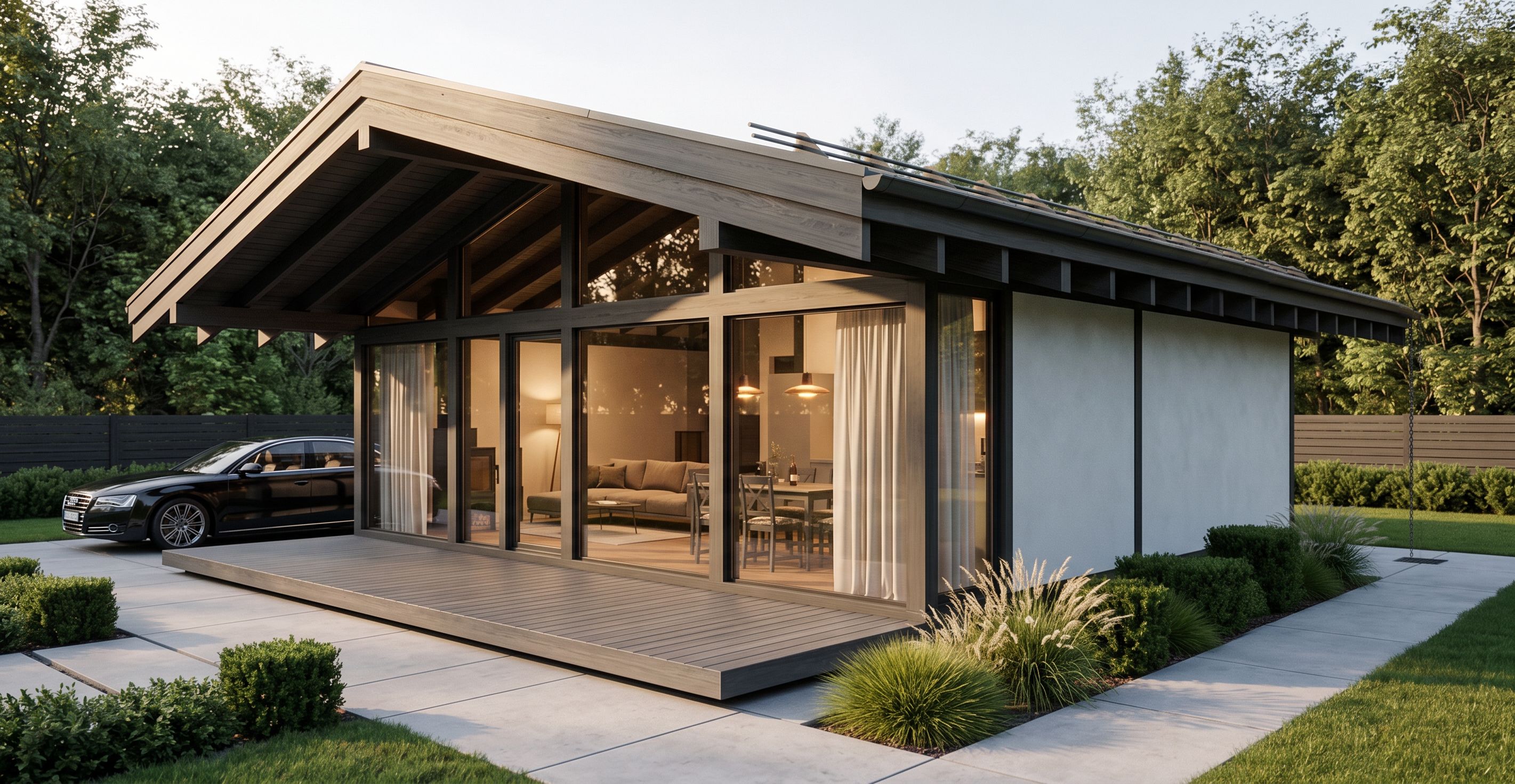 Современный одноэтажный загородный дом в стиле минимализм с элементами скандинавской и японской архитектуры, компактный объём с двускатной крышей и широкими свесами. Конструктивные балки и элементы кровли выполнены в цвете тёмный графит dark graphite wood. Фасад сочетает панорамное остекление в тонких тёмных алюминиевых рамах и светлые гладкие панели. Перед домом устроена терраса из дерева в цвете серый графит, без видимых свай или опор, выглядит как монолитное основание на уровне участка. Терраса плавно переходит в покрытие из крупноформатной бетонной плитки светло-серого цвета с тонкими швами. Слева от дома припаркован современный седан чёрного или тёмно-серого цвета, стоящий строго на плитке. Участок с ухоженным газоном, аккуратные кусты и декоративные злаки у террасы. По периметру — забор и густые лиственные деревья. Цепь водостока аккуратно свисает и уходит в скрытый дренаж в плитке, без камней и декоративных элементов. Через стекло виден интерьер: диван, стол, тёплый свет, лёгкие шторы. Освещение — тёплый мягкий golden hour, длинные тени, реалистичная глобальная иллюминация. Камера: уровень глаз, трёхчетвертной ракурс на стеклянный угол дома, объектив 24–28mm, кинематографичная композиция., keep exact camera angle