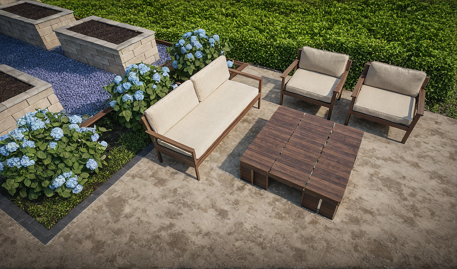 Enhance, tan house, hydrangea, brown fence