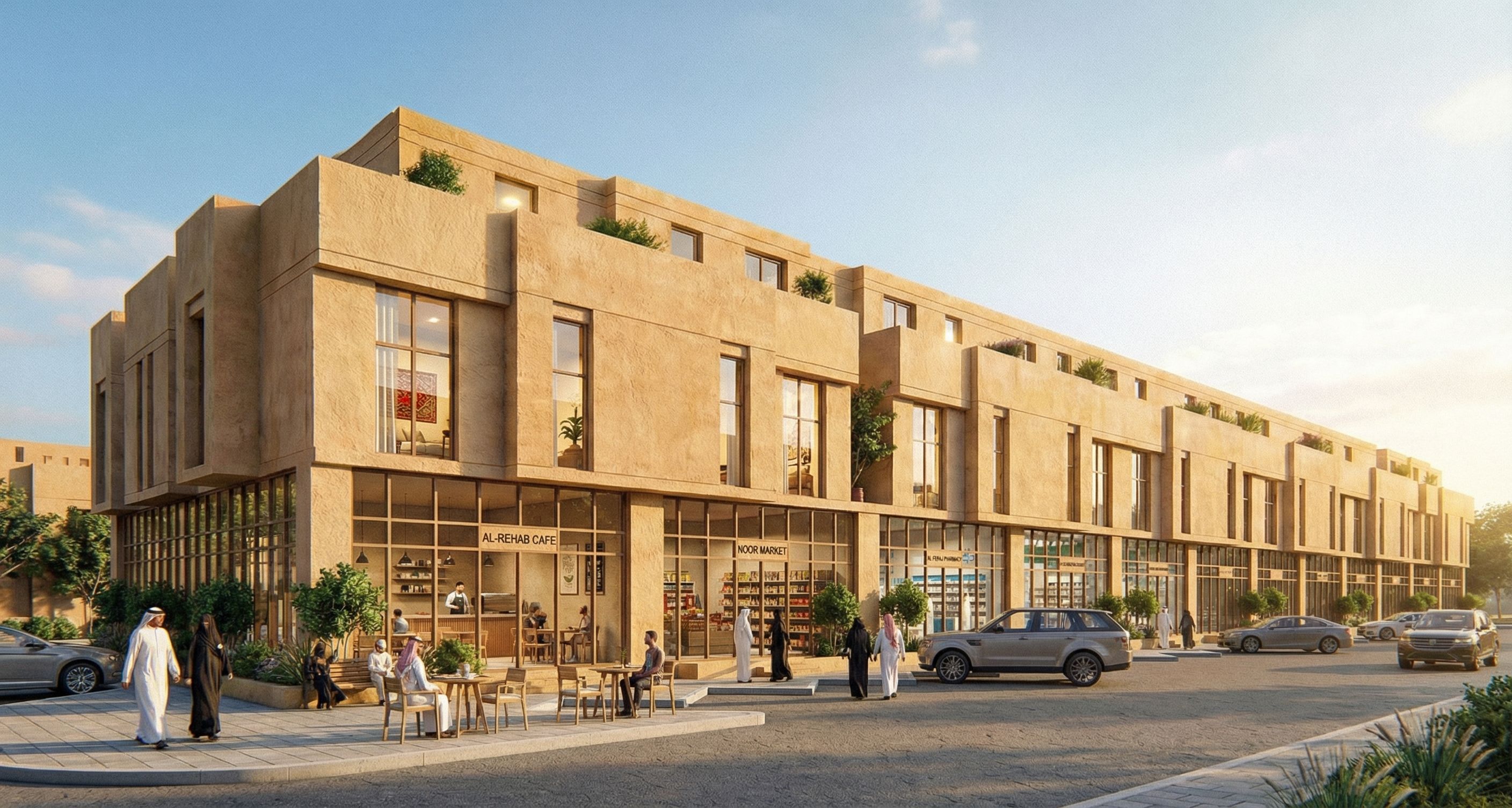 Add shops interior details cafe extra with signs names.. & appartments in first floor furniture, add saudi families & cars, keep exact camera angle