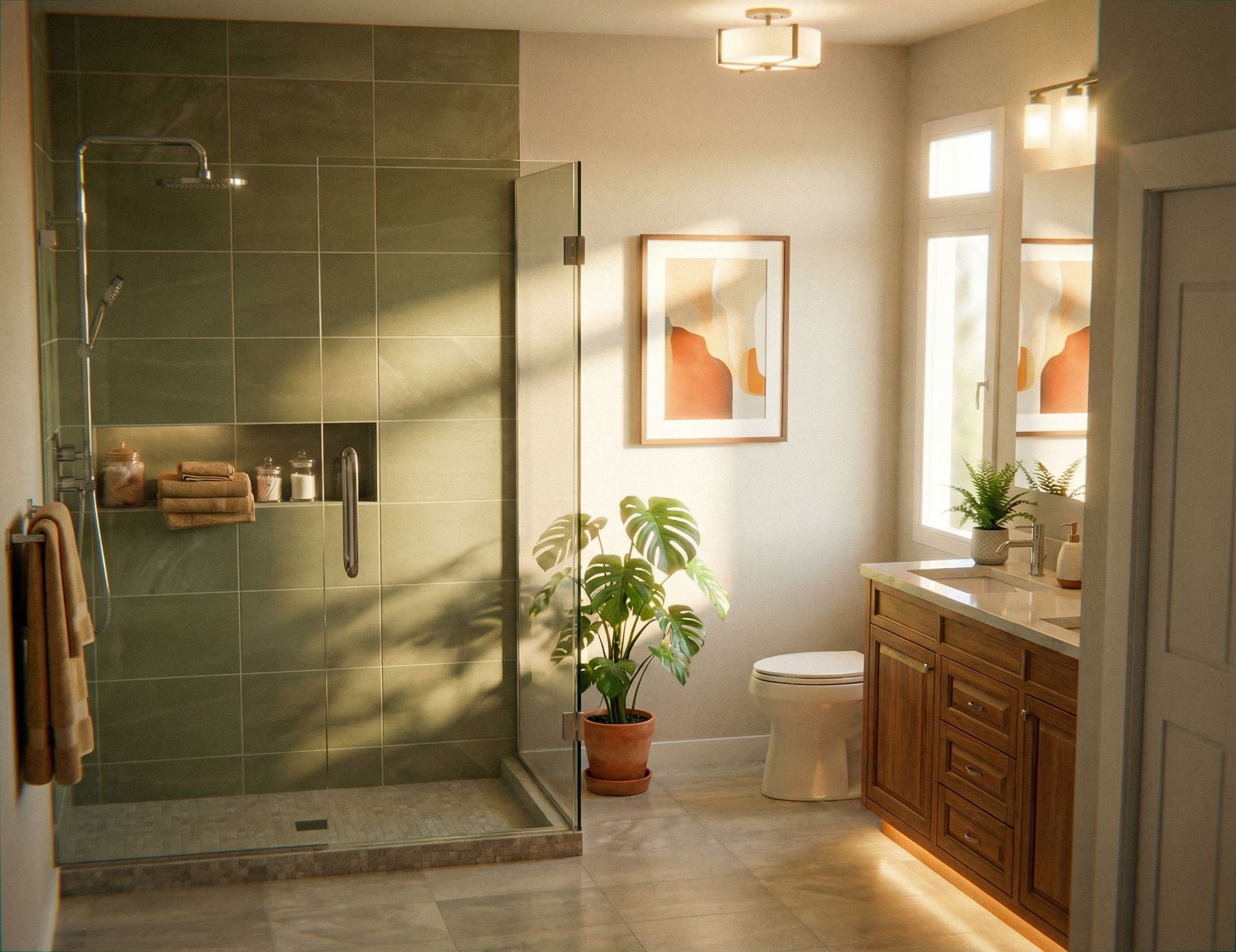 PromptPhoto of a modern bathroom interior featuring a glass shower enclosure and a dual-sink vanity. Emphasize the sleek design elements, including smooth stone textures, polished surfaces, and contemporary fixtures. Set in a bright urban apartment context, with natural light streaming through the window, casting soft shadows. Capture the scene from a slightly elevated angle, using a wide-angle lens to enhance the spatial depth and highlight the elegance of the space. warm tones, green shower tiles,, keep exact camera angle