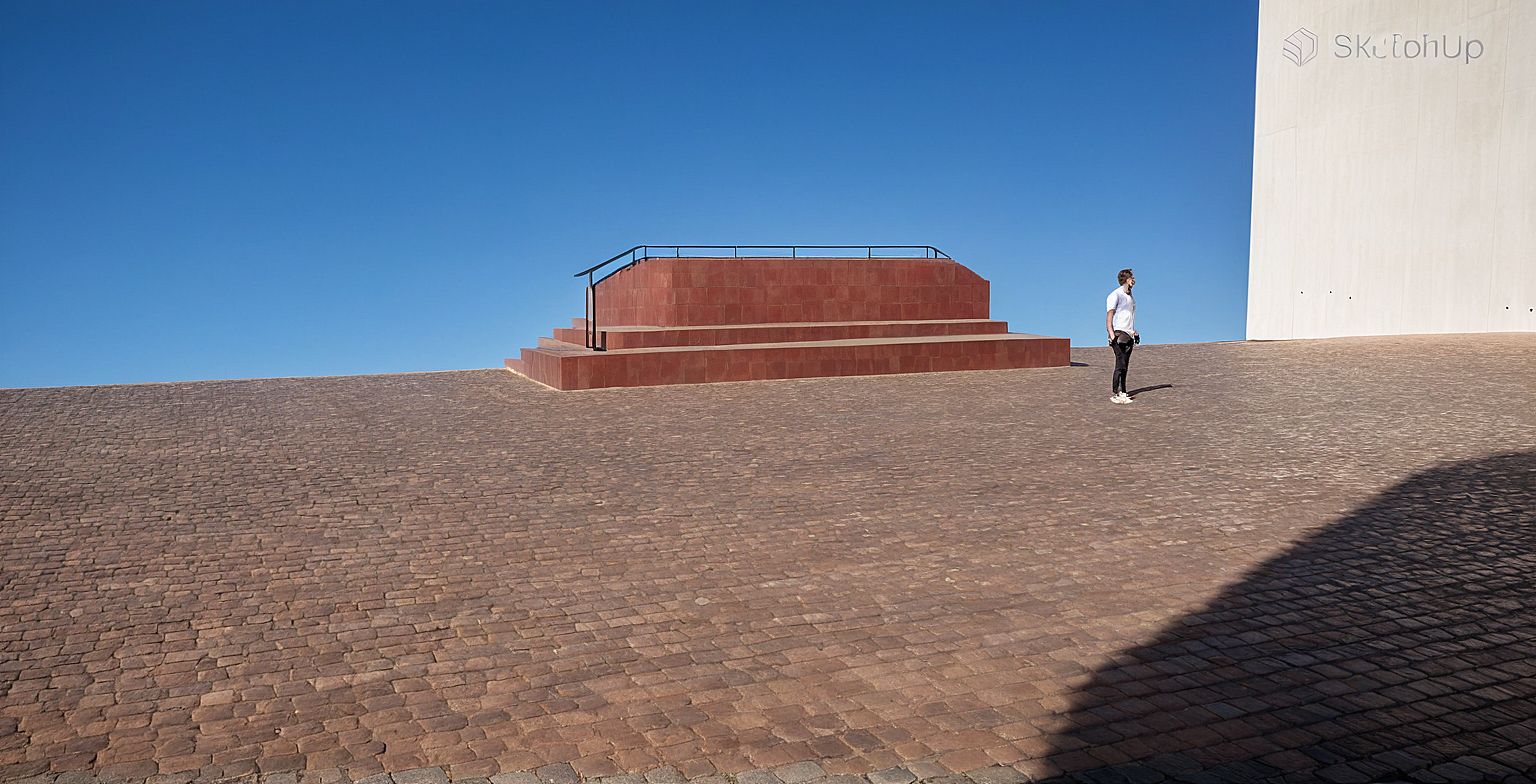 PromptPhoto of a modern architectural platform with tiered levels, featuring a mix of smooth concrete and the wall made of big, rough, red sandstone chunks. The surrounding cobblestone pavement adds an earthy touch, complementing the sleek design. Captured during the day with warm sunlight casting gentle shadows, highlighting the textures. A low-angle perspective frames the scene, emphasizing the scale of the structure against a clear sky while capturing the figures engaged in conversation. Black Steel railing on top of platform
