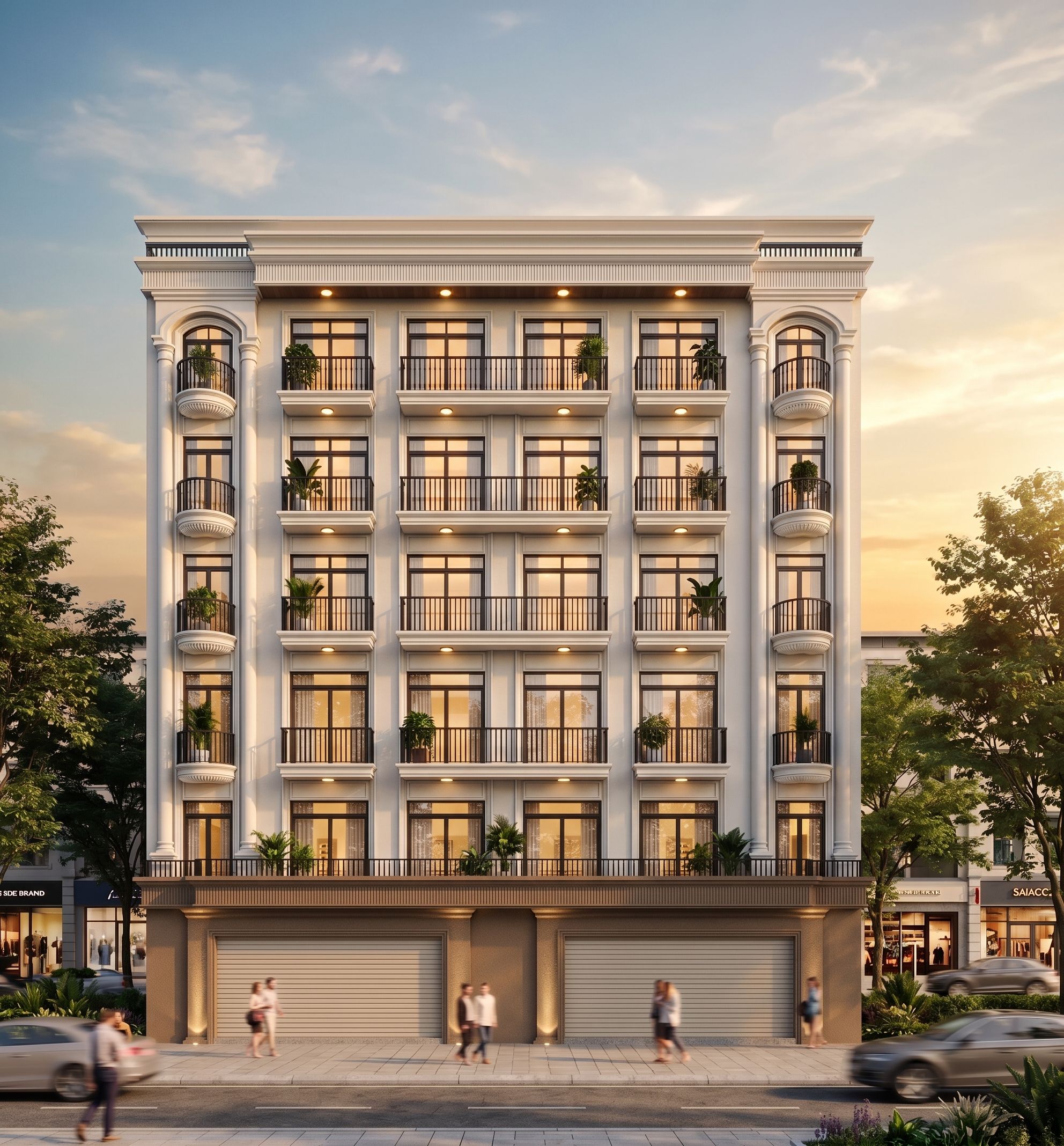 PromptThe photograph depicts a classic residential building with elegant balconies and refined architectural details. The facade is finished in smooth white stucco, accented with decorative moldings. The entire first floor is spray-painted in a textured dark beige, while the upper floors are painted smooth white, creating a surface effect that enhances visual depth. The curved balconies are further embellished with curved decorative elements at the bottom and feature decorative trim. The large doors on the first floor are roll-up doors. Below the balconies, round LED lights are installed, reflecting light from the bases of round and square columns. Black painted iron railings, decorated with potted plants, are placed on the balconies. The entire interior lighting system of the building highlights the light and shimmering effect of the glass windows. Located in an urban area, facing the street and with a sidewalk, the building is surrounded by shops and greenery, further enhancing its charm. The scene is illuminated by the warm golden light of sunset, creating soft shadows and highlighting the surfaces. The photograph retains its original angle and design., keep exact camera angle