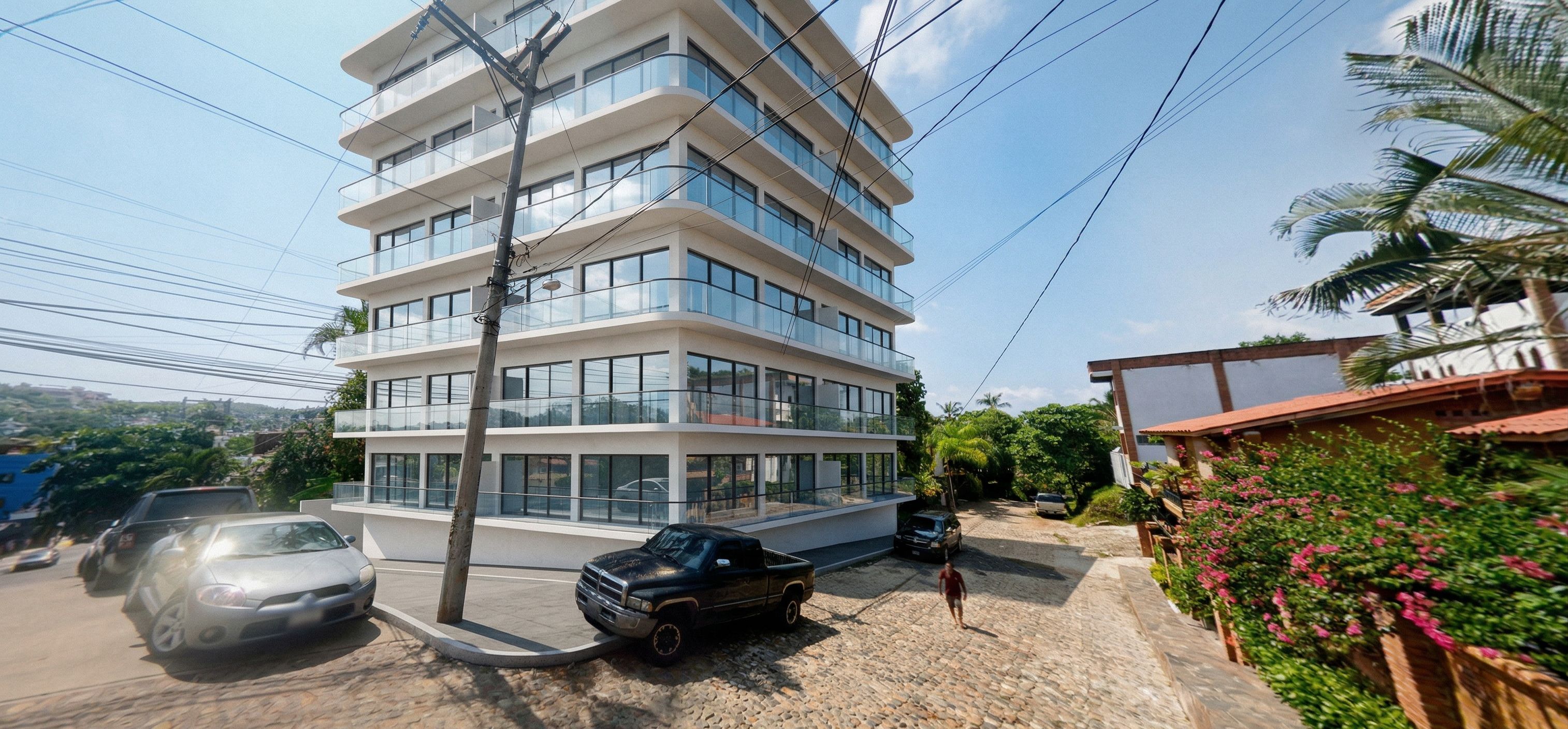 PromptPhoto of a modern multi-story residential building, with elegant glass balconies and large windows. Emphasizes the smooth white facade and contemporary architectural lines. The urban environment shows neighboring structures and green areas nearby, highlighting the texture details. Capture the scene from a low angle using a wide-angle lens, focusing on the interaction of light and reflections on the glass surfaces, showing the vibrant urban life surrounding the building. PLACE IN THE WHITE PART OF THE REFERENCE IMAGE