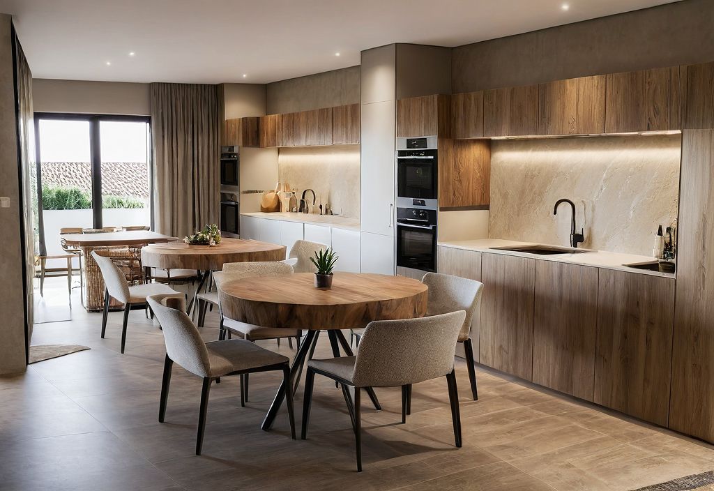 PromptEspacio de comedor común moderno con estilo brutalista sofisticado. Paredes de hormigón visto y suelo de madera cálida tono roble. Iluminación principal mediante carriles en techo con focos orientables, luz cálida ambiental. Zona de cocina con máquinas integradas, superficies minimalistas en metal y hormigón. Incluye zona social con mesas modernos en tonos cálidos y neutros, mesas auxiliares de madera, plantas naturales. El ambiente debe ser chic, acogedor y sofisticado, combinando brutalismo con materiales cálidos. Texturas naturales, textiles suaves, luz cálida indirecta, atmósfera relajada y moderna.