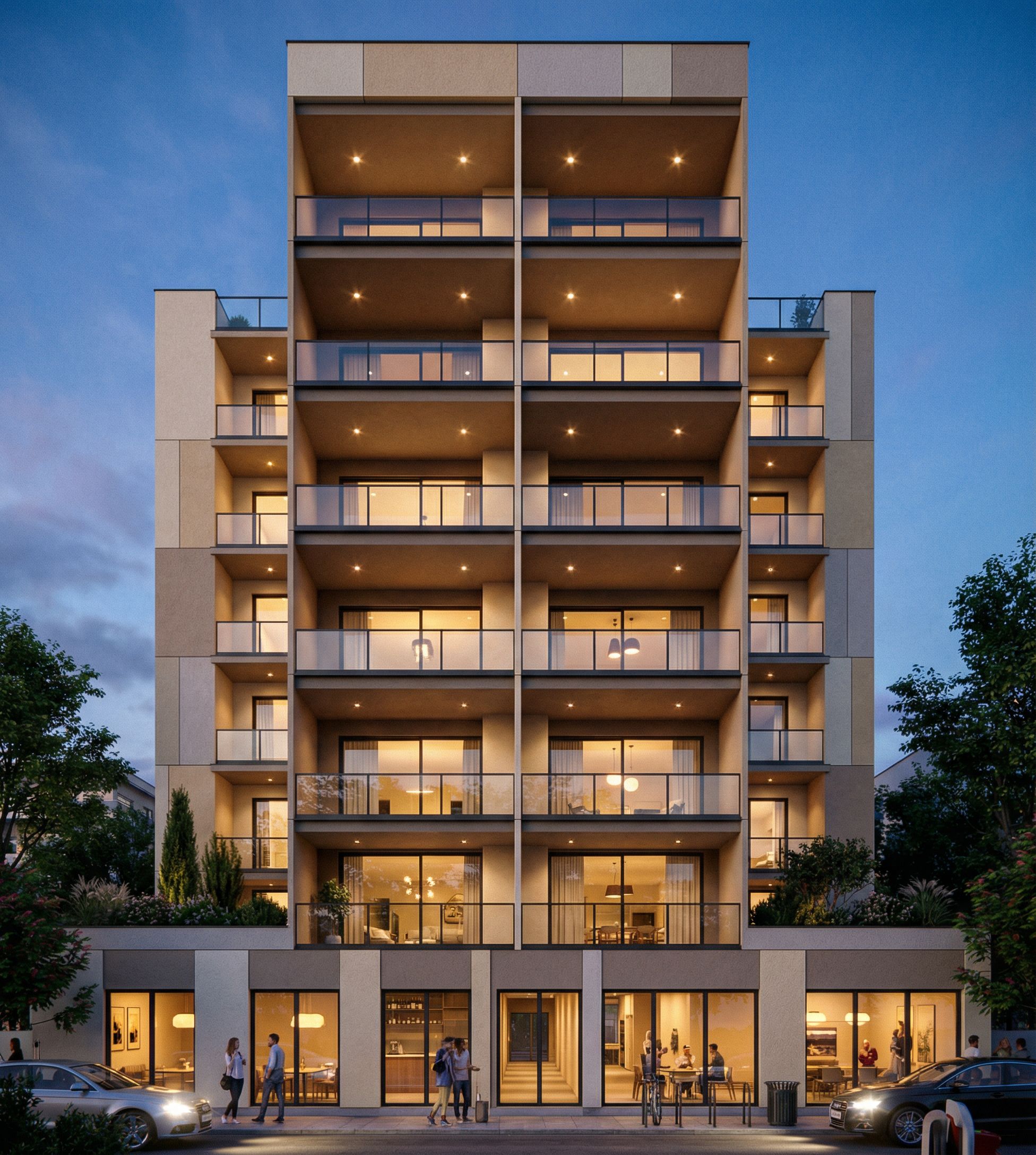 Ultra realistic architectural render of the provided building model. 🚨 STRICT GEOMETRY PRESERVATION Use the provided building image strictly as the base reference. DO NOT modify the architecture in any way. DO NOT change building shape, volumes, slabs, window placement, balconies or proportions. KEEP EXACT CAMERA ANGLE AND BUILDING SILHOUETTE. 🚨 IMPORTANT STRICTLY KEEP ORIGINAL GLASS BALCONIES. DO NOT replace, modify or redesign the glass railings. The balcony guardrails must remain transparent glass panels exactly as in the original model. Façade Treatment Apply a contemporary façade treatment using textured stucco crépis panels in a vertical patchwork composition. Color palette: light beige sand taupe soft greige warm stone Texture variation: fine mineral plaster slightly rough stucco brushed plaster finish Clean vertical segmentation with precise joints. Balconies KEEP ORIGINAL BALCONY GEOMETRY AND GLASS RAILINGS. Recessed balconies with darker inner tones creating depth warm taupe shadows. Transparent glass balcony railings preserved exactly as in the original model. Window frames: matte black or dark bronze aluminum. Balcony Lighting Add integrated recessed ceiling spotlights in balcony slab soffits. Lighting: warm white 2700K – 3000K soft light wash on balcony walls subtle glow under balcony ceilings. Interior Lighting Visible interior apartment lighting through windows: warm ambient lighting floor lamps pendant lights soft bedroom lighting Natural variation between units. Atmosphere Time of day: blue hour / early evening Balanced contrast between: cool natural sky warm building lights Rendering quality: photorealistic global illumination soft shadows ambient occlusion micro material detail 4K architectural visualization, keep exact camera angle