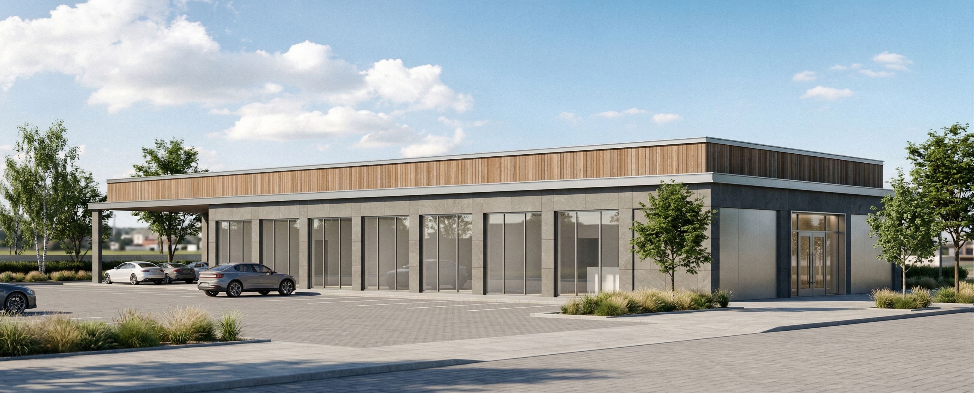 Prompt"Convert the provided SKETCH into a high-quality 3D exterior render of a single-story commercial retail building. The design must strictly preserve the exact dimensions, proportions, and layout of the original plan without any alterations. The main entrance is located on the short side labeled 'ENTRANCE' and should be clearly visible and emphasized in the design. All shop façades must be fully glazed (floor-to-ceiling glass) with a clean, continuous storefront appearance and no visible doors. Include the parking area as indicated in the plan. This area should have no walls, but must be fully covered by a roof that is aligned at the same height as the main building roof. The camera angle should be a perspective view taken from the position marked by the red arrow on the plan (representing the camera location). The view must capture both the main entrance and the long façade of the building. Use realistic architectural materials, natural lighting, soft shadows, and a clean modern style to enhance the visualization. Ensure accurate scale and proportions throughout the model.", keep exact camera angle