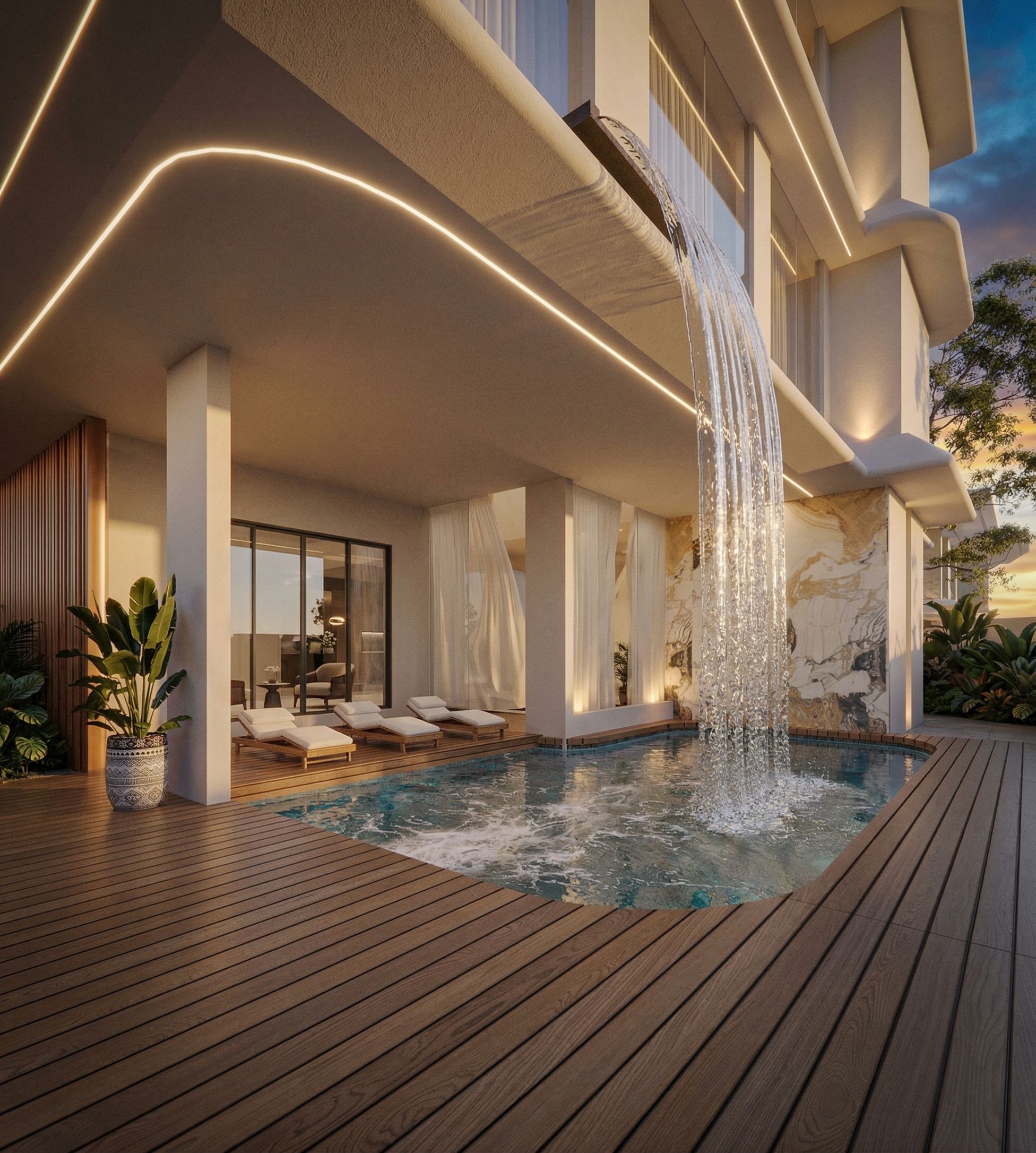 PromptA realistic architectural visualization of a modern villa at golden hour. The building features a mix of smooth concrete, warm timber slats, and floor-to-ceiling glass. Soft exterior uplighting hitting the facade. Surroundings include lush tropical landscaping with realistic leaf textures and soft shadows. High dynamic range, D5 render style, hyper-detailed., keep exact camera angle