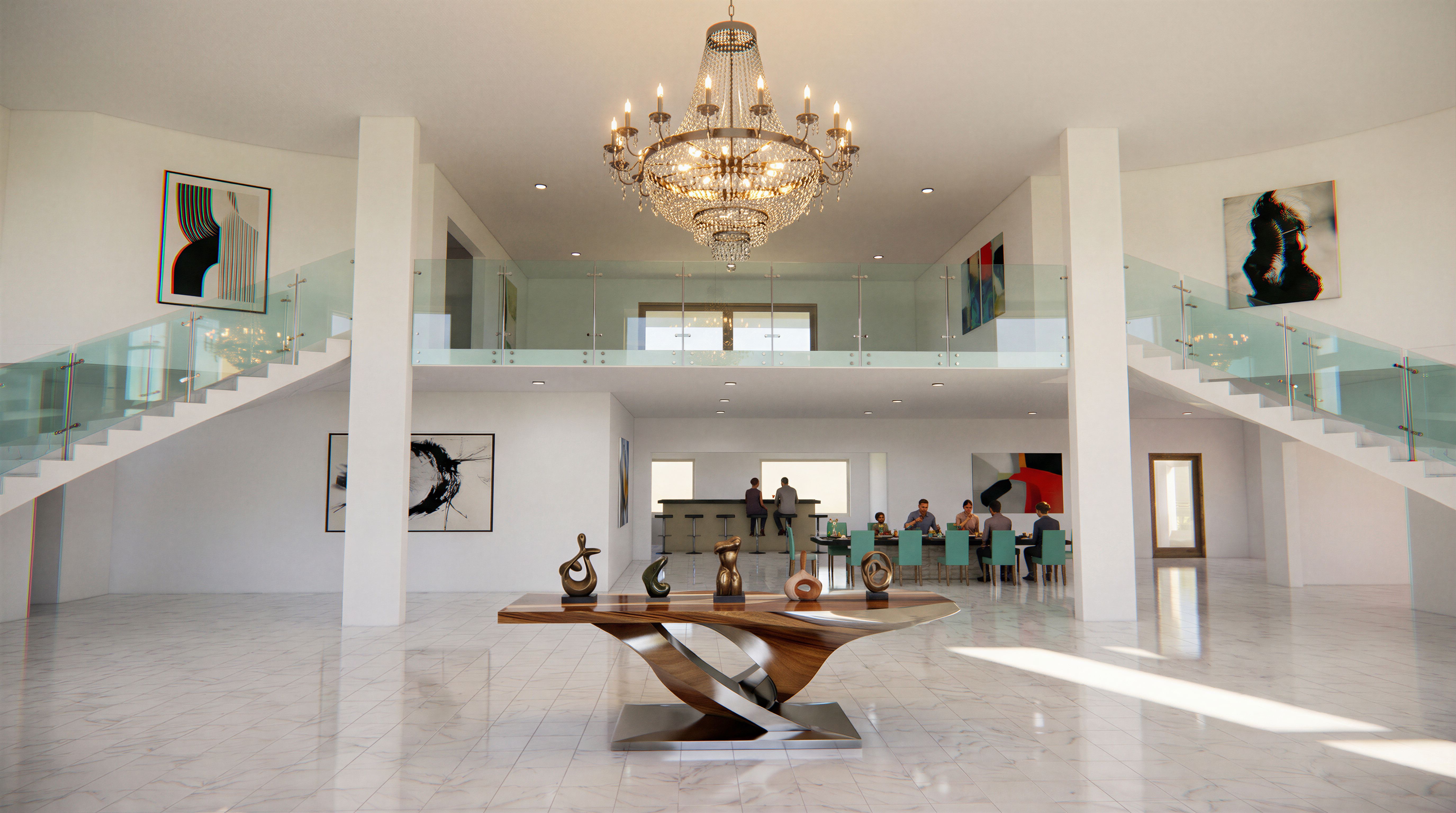 EnhancedPromptthis is an interior of a residential mansion. this is the entry space (foyer). in this foyer, add a chandelier light above the space. below the chandelier put a very nice unique centre table with small sculptures on it. In the image, a dining table is visible, just add some few people seated on it. a kitchen island is further visible in the image, add 2 people also at that kitchen island seated on the stools. make the floor finish a white marble tile floor finish. add some modern contemporary art pieces on the walls in the image. make the railings that are visible in the image into a glass panel railing design, keep exact camera angle