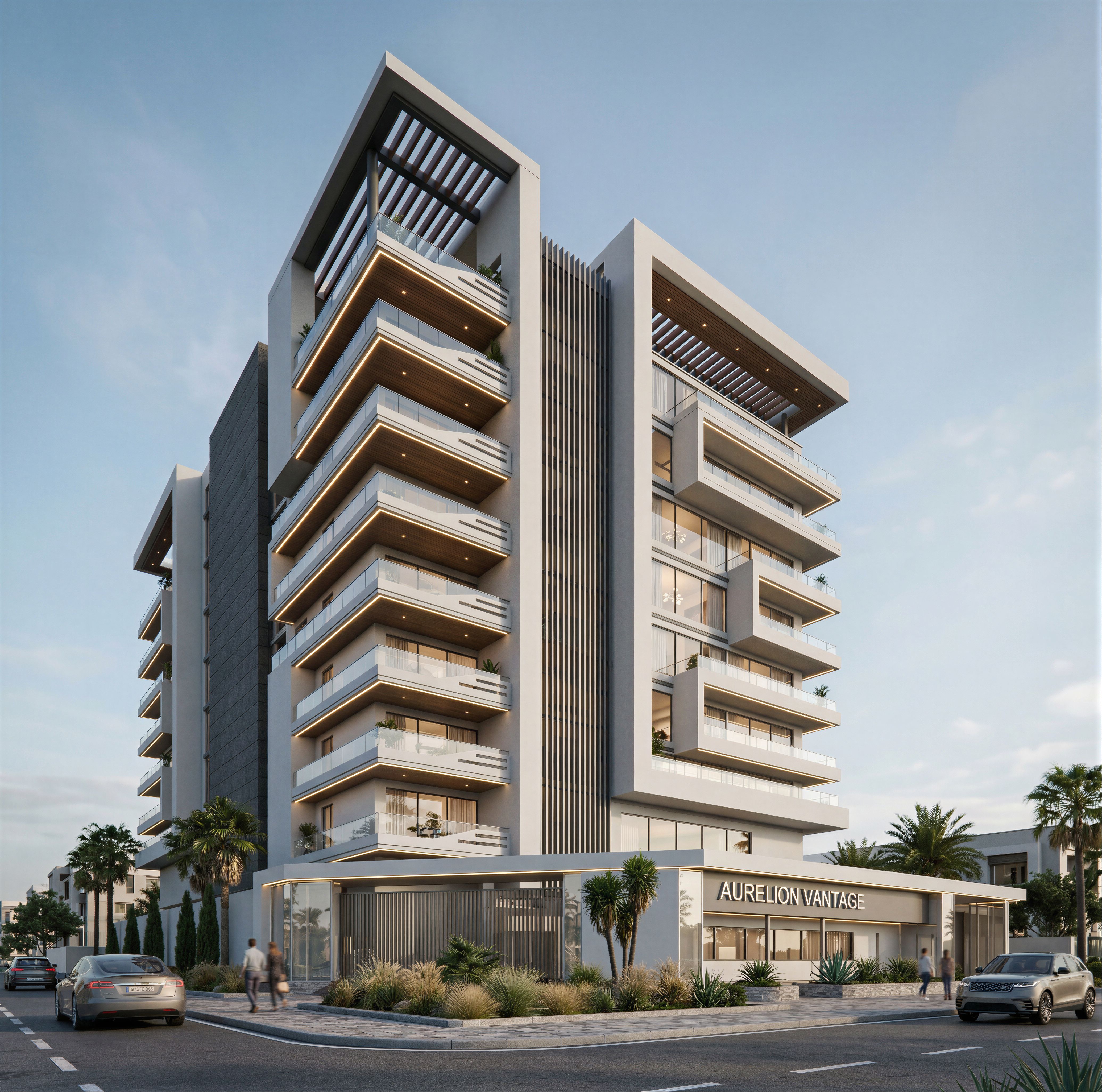 PromptA beautiful photo-realistic render of a modern apartment building featuring clean, elegant lines and well-framed glass panels. Sleek glass railings accent the balconies, highlighting the building’s contemporary form. Subtle ambient daylight reflects softly off the glazing, revealing warm interior furnishings and refined material textures inside. There are some walls and under-slab reveals hosting linear striplights with warm light. Wall themes is predominantly White & light grey, entrance gate house has some curtain wall glazing on the front. The exterior environment is highly detailed — landscaped walkways, gentle shadows, realistic vegetation, and calm, ultra-sharp details, accurate reflections., keep exact camera angle