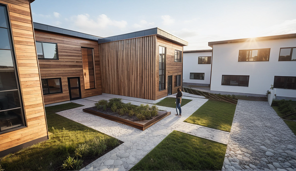 PromptDo not make changes to the model and materials. only one side of the building is wooden plank facade. it is afternoon