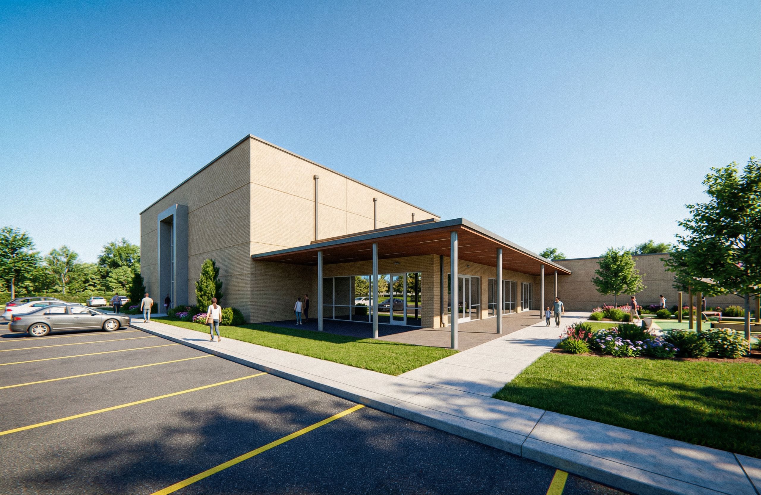 Photo of a modern commercial Church building, featuring sleek glass, gray paneling, wood soffit, and natural beige brick facades. Set within a suburban landscape with adjacent parking, clearly defined pathways, and manicured green lawns. Captured in bright daylight, highlighting reflections and shadows on the surfaces. Maintain the perspective and camera angle of the image. Do not add additional windows to the facades. There should be green space to the right for leisure. , keep exact camera angle