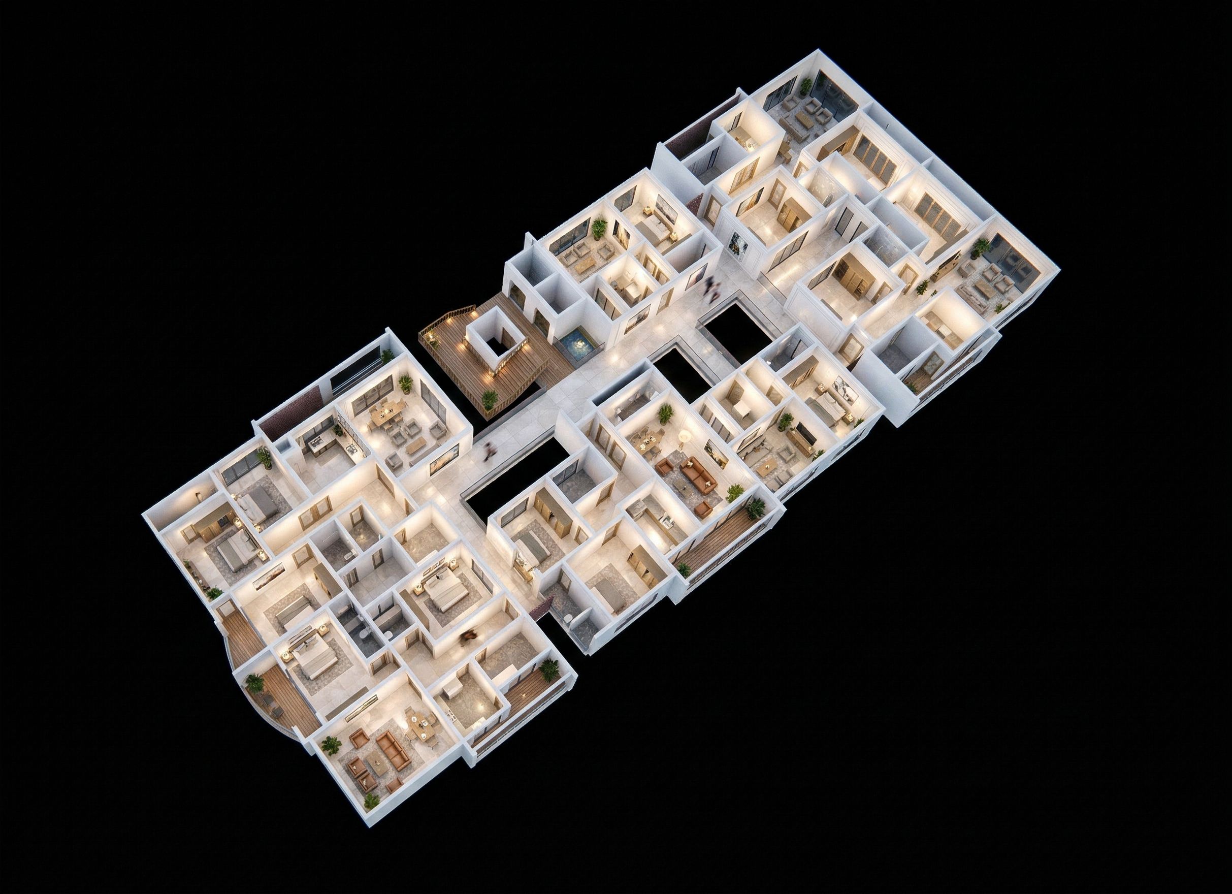 PromptAERIAL VIEW OF A LAYOUT WITH LIGHTS TURNED ON IN THE HOUSE. , INCLUDE MOULDINGS IN WINDOWS AND OPENINGS. USE BRILLIANT WHITE ON THE WALLS . MAKE THE GLASS CLEAR, REALISTIC AND TRANSPARENT. USE CERAMIC TILES ON FLOOR. MAKE IMAGE BRIGHT HIGH RESOLUTION 8K WITH A BLACK BACKGROUND., keep exact camera angle