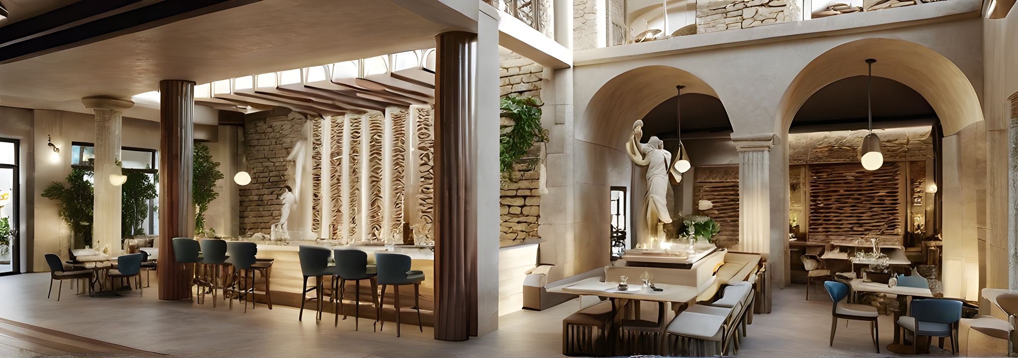 PromptCreate a realistic render of a modern restaurant with Greek architectural style, featuring Roman or Greek columns and ancient ruin-like walls combined with glass elements, as if emerging from Poseidon’s ruins. Use sleek, modern furniture and Greek statues for decor. The design should blend ancient elegance with contemporary luxury. The predominant texture should be microcement