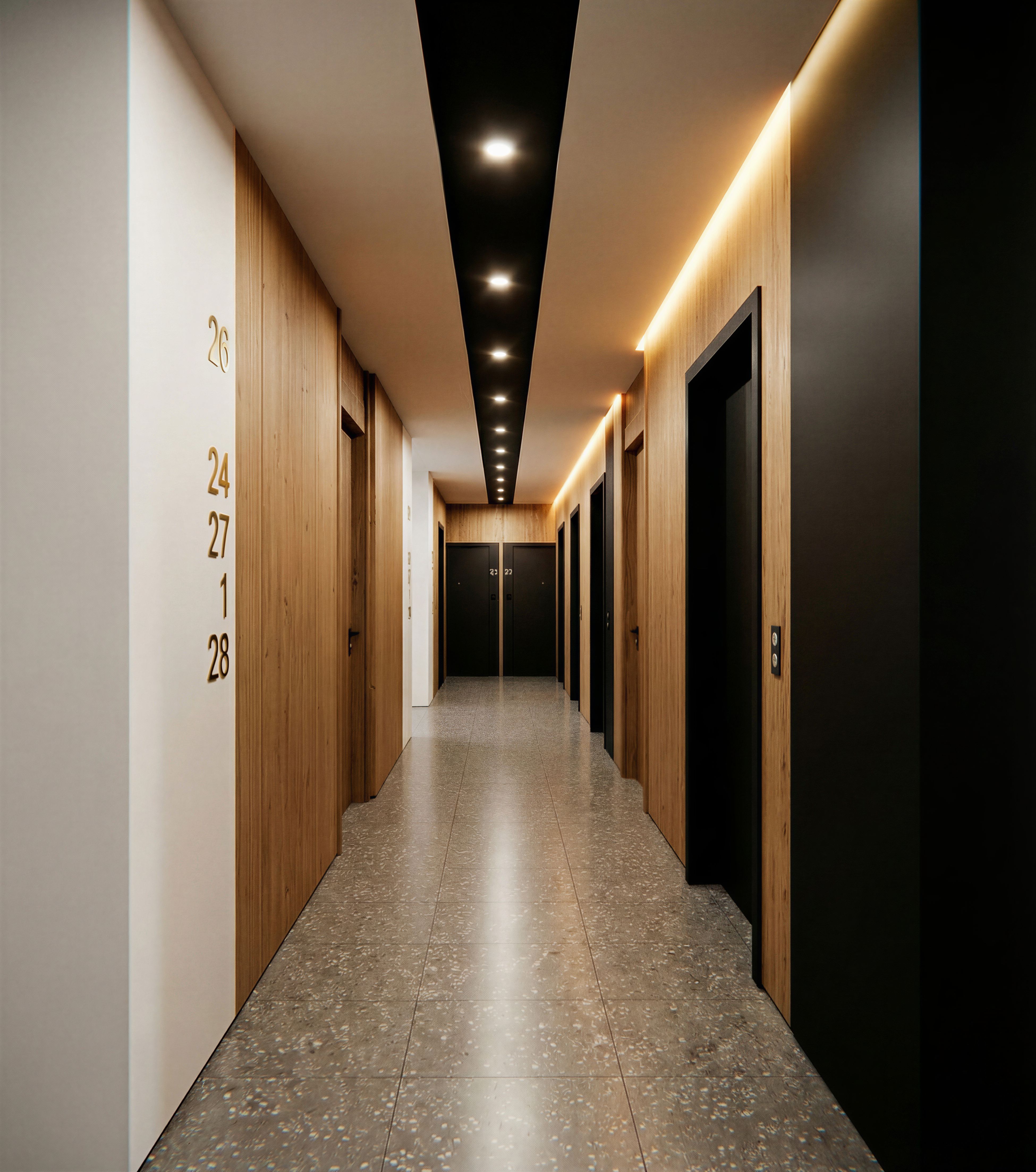 EnhancedPromptPhoto of a contemporary multi-story residential building corridor, featuring sleek white walls and warm wooden accents. The terrazzo flooring adds texture, while contrasting black elevator doors enhance modernity. Soft, ambient lighting casts gentle shadows, creating a welcoming atmosphere. Perspective captured from an elongated angle, showcasing depth and symmetry, with a slight tilt using a wide-angle lens to emphasize the corridor's length. Ideal for architectural visualization, highlighting luxurious living spaces and the harmony of modern materials., keep exact camera angle