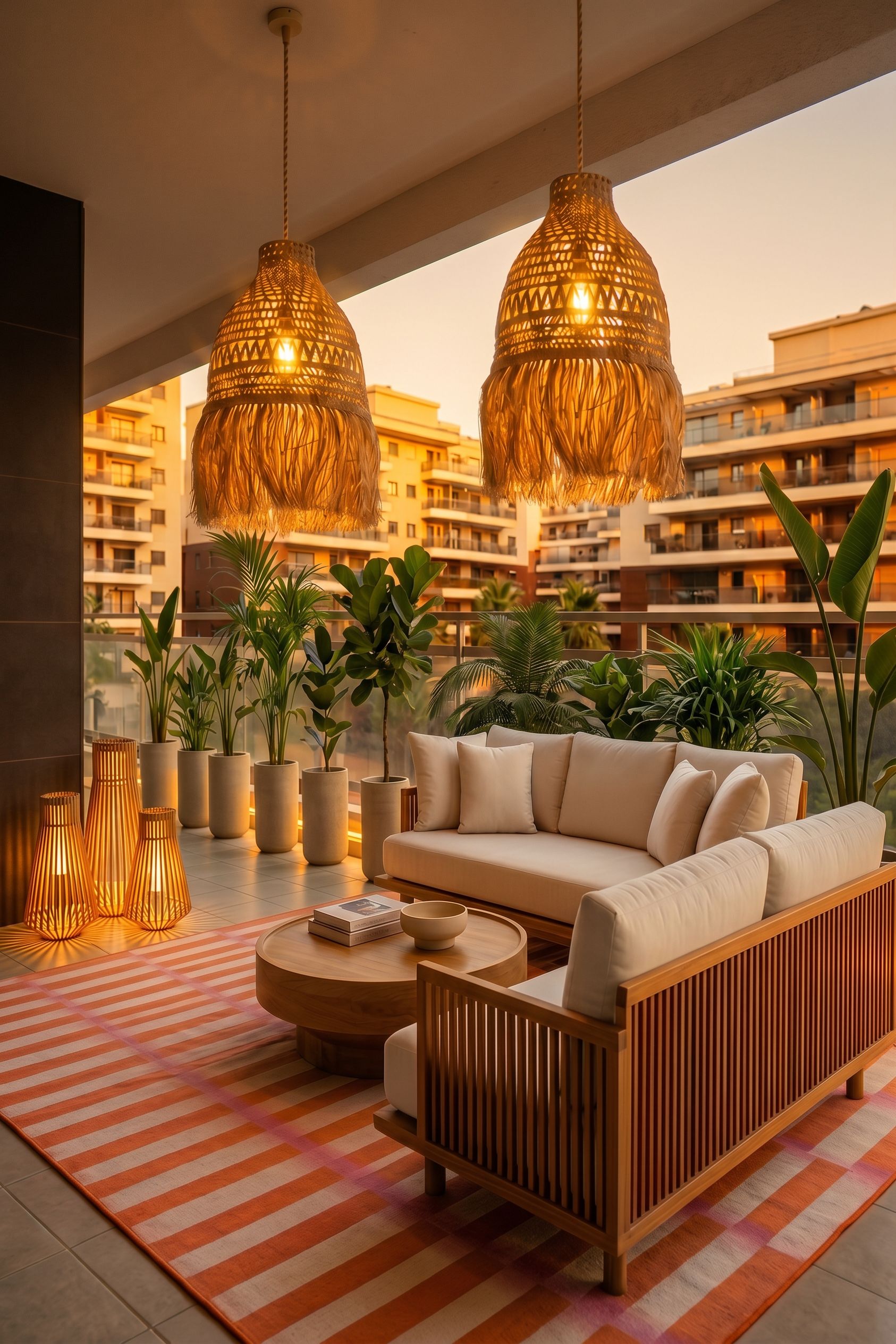 retirar o muro branco e os vasos do lado esquerdo. distribuir os vasos mais espaçados e colocar também atras do sofá. as plantas dentro dos vasos mais cheias conforme referência. colocar 3 lamparinas junto à parede esquerda castanha conforme referencia, keep exact camera angle