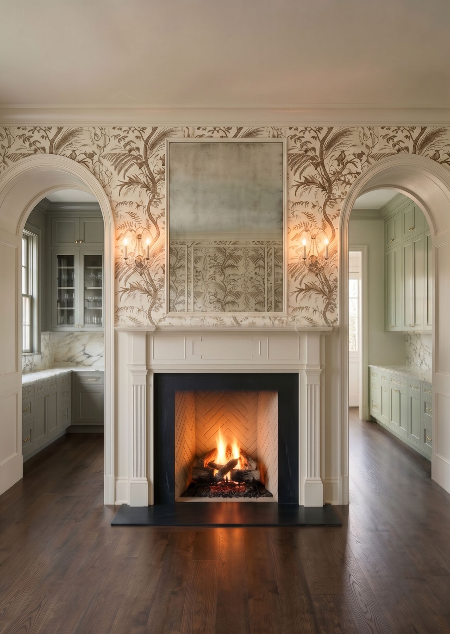 PromptKeep everything in the dining room with the fireplace the same. Looking through the arch on the right, you see a continuation of the cabinets on left. That room is not deep enough to have cabinets on the exterior wall, there are only cabinets on the back wall and they should appear a bit paler and a bit more green than they do in that picture. The counters are Vermont Danby. The ceilings throughout should appear about 12" shorter., keep exact camera angle