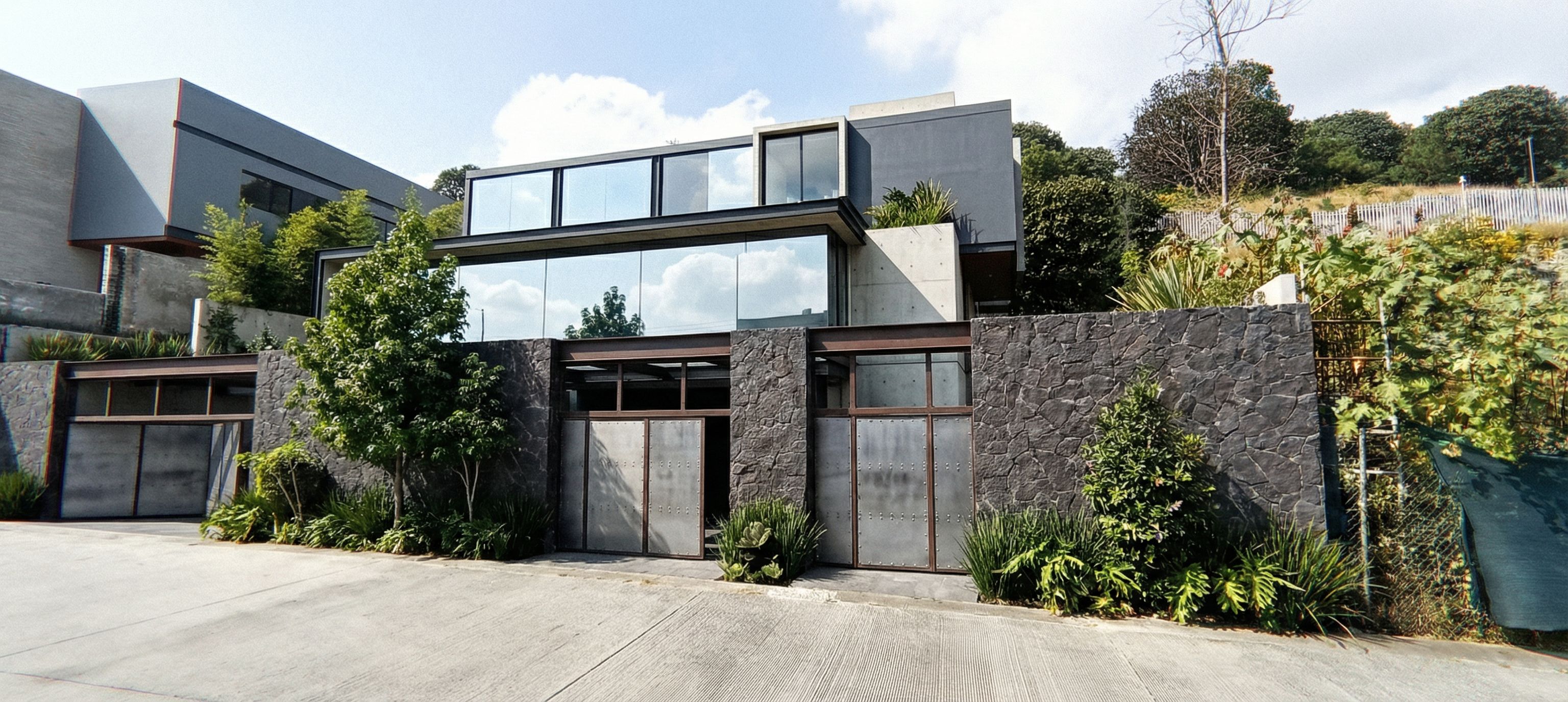 imagen frontal de un edificio residencial moderno con elegantes formas geométricas y grandes ventanales de cristal. La fachada combina piedra oscura texturizada con superficies de hormigón lisas y portones con placas metalicas sostenidos por vigas aparentes , enfatizando una estética contemporánea. Situadas en un paisaje urbano minimalista, las estructuras cercanas muestran una mezcla de estilos residenciales. La escena está iluminada por una suave luz del día, proyectando sombras delicadas sobre la fachada. Capturada desde un ángulo bajo, la perspectiva resalta la altura y modernidad del edificio, enmarcada para incluir la vegetación y la arquitectura circundantes, evocando una sensación de sofisticación y tranquilidad. la imagen de referencia solo tomar lo que esta alrededor y el fondo de la residencia , no tomar la referencia del edificio central , se repeta la imagen original en sus formas y diseño