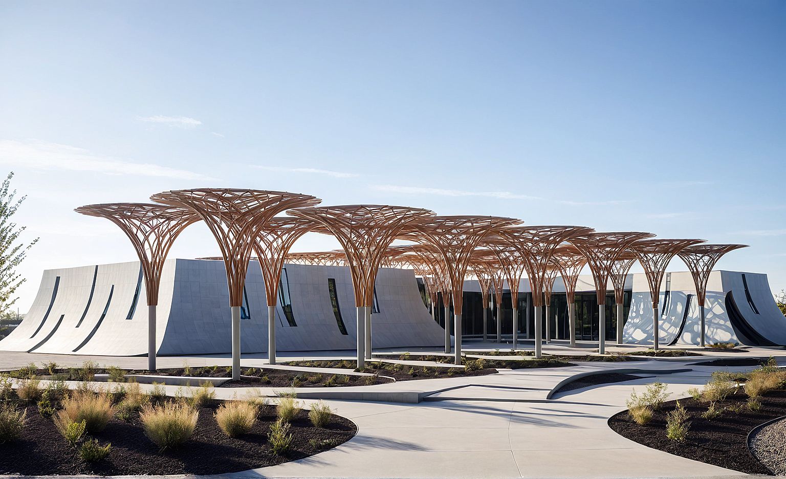 PromptPhoto of a contemporary pavilion featuring dynamic, branching structures with a lattice pattern. Surrounded by a minimalistic landscape, the softly curved surfaces contrast the angular design elements. Bright, diffuse daylight creates playful shadows under the canopies. Captured from a slightly elevated angle, emphasizing the unique geometry and spatial relationship to the ground, using a wide-angle lens for depth enhancement.