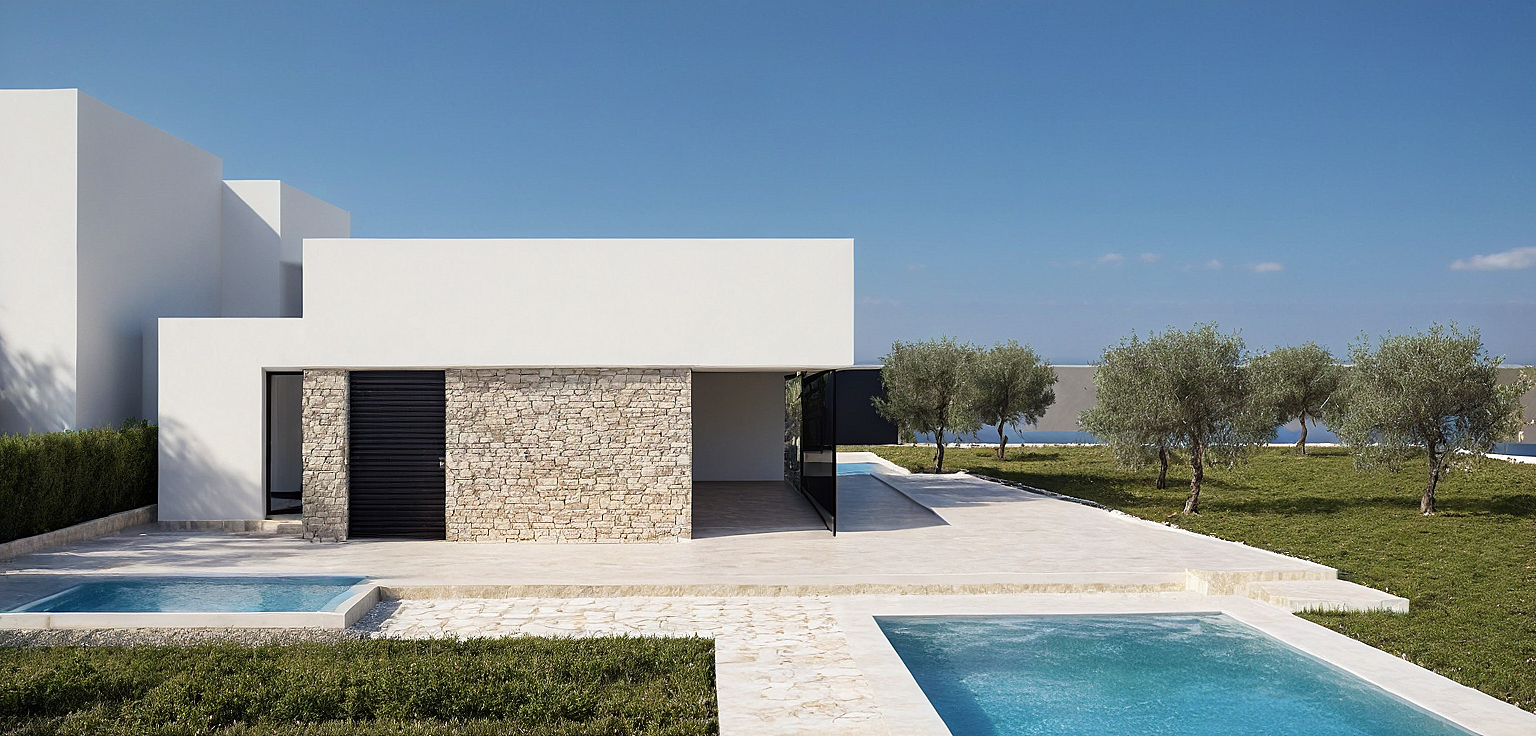 Single family house in greece, minimalistic aproach, exterior rendering. Blue sky. Terrace with screed. Olive trees in the garden around the terrace. Glazing with black framing. Roofs with grass. Walls white and partly with beige stone cladding. Main entrance door bright wood.