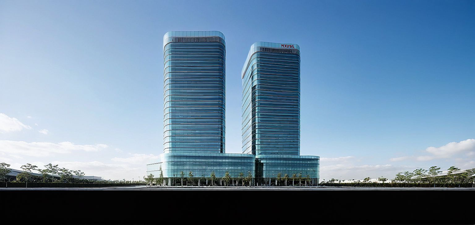 PromptModern corporate twin tower facade design, Toyota headquarters, glass and aluminum facade with vertical sunshading fins, inspired by Japanese minimalism and high-tech architecture, clear articulation between podium and towers, south-east Asian tropical context, detailed daylight render