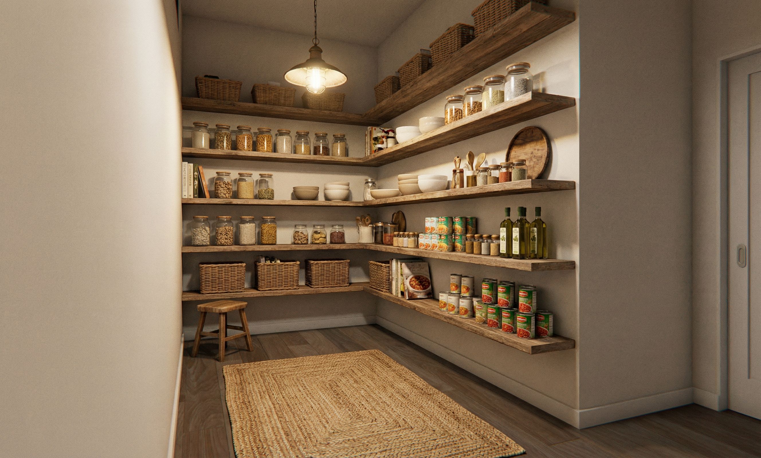 Create a photorealistic rendering of Farmhouse style pantry room, add shelving, add misc. items where appropriate, keep exact camera angle