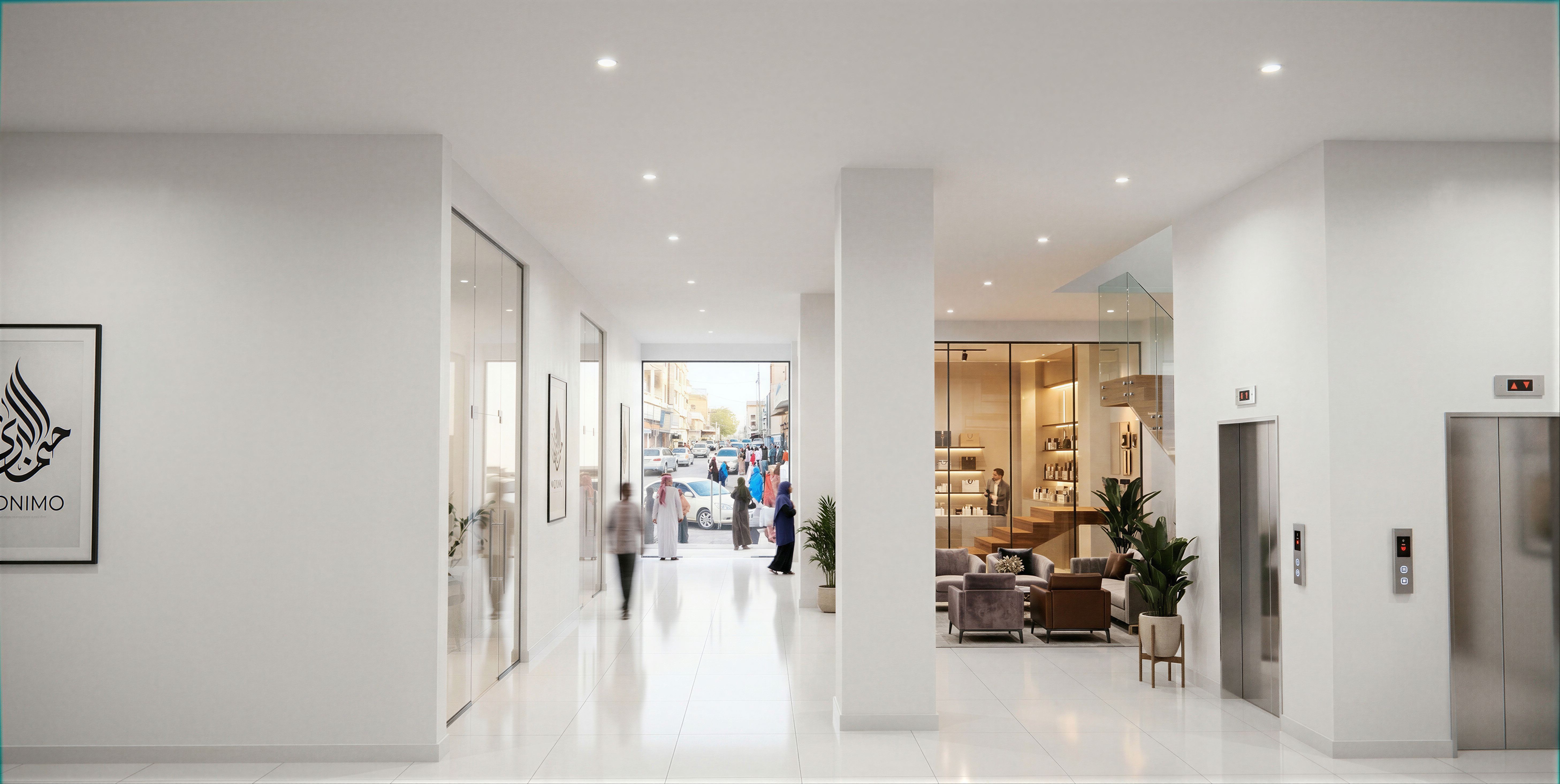 INTERIOR CORRIDOR AND LOBBY OF A HIGH END APARTMENT VIEWED FROM THE CORRIDORS. HAVE SIMPLE GYPSUM CEILING WITH SPOT LIGHTS. MAKE INTERIOR HIGH WITH FRAMELESS GLASS PARTITIONS ON EITHER SIDE. ON RIGHT SIDE SHOWING SHOPS WITH DISPLAYS AND ON THE RIGHT HAND SHOWING AN ELEGANT WAITING LOUNGE AND A LIFT LOBBY AT THE RIGHT SIDE IN THE FORE GROUND. TURN ON THE LIGHTS IN THE SHOPS , WAITING LOUNGE AND OFFICES. HAVE THE NAME MIDNIMO IN ONE OF THE ART WORK ALONG THE CORRIDOR. MAKE RESOLUTION HIGH AND PHOTOREALISTIC 8K. MAKE BALUSTRADES BE OF CLEAR GLASS. HAVE A COMMERCIAL STREETSCAPE VISIBLE DIRECTLY IN THE BACKGROUND DIRECTLY AT THE BACK SHOWING CARS AND PEOPLE OF SOMALI ORIGIN. MAKE WALLS, COLUMNS AND CEILINGS BRILLIANT WHITE AND ELEGANT. USE PORCELAIN TILES ON FLOOR., keep exact camera angle