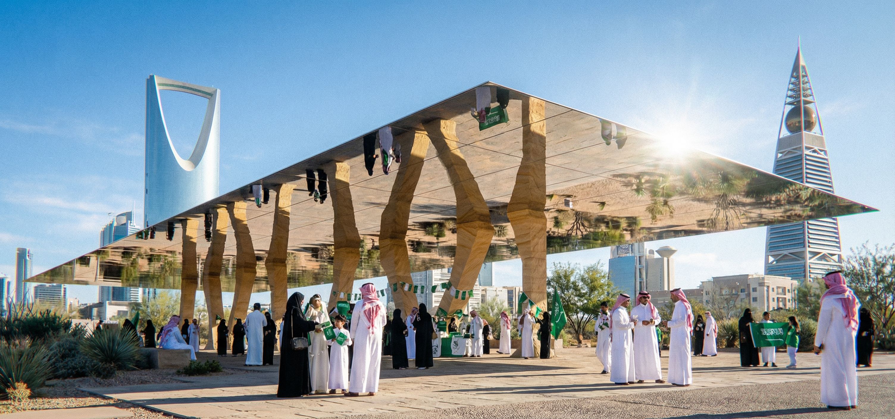 saudi families , Riyadh background , same camera angle , saudi national day, keep exact camera angle