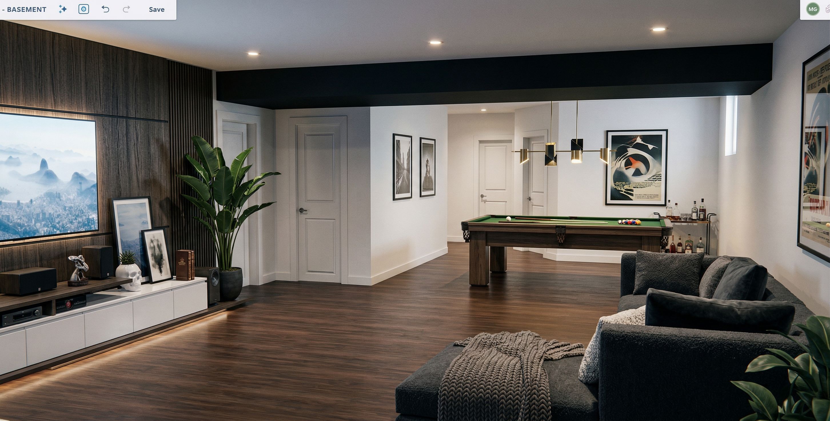 PromptFun basement area, games and movie themed, black bulkead with no lights, pot lights in white ceiling areas, , keep exact camera angle