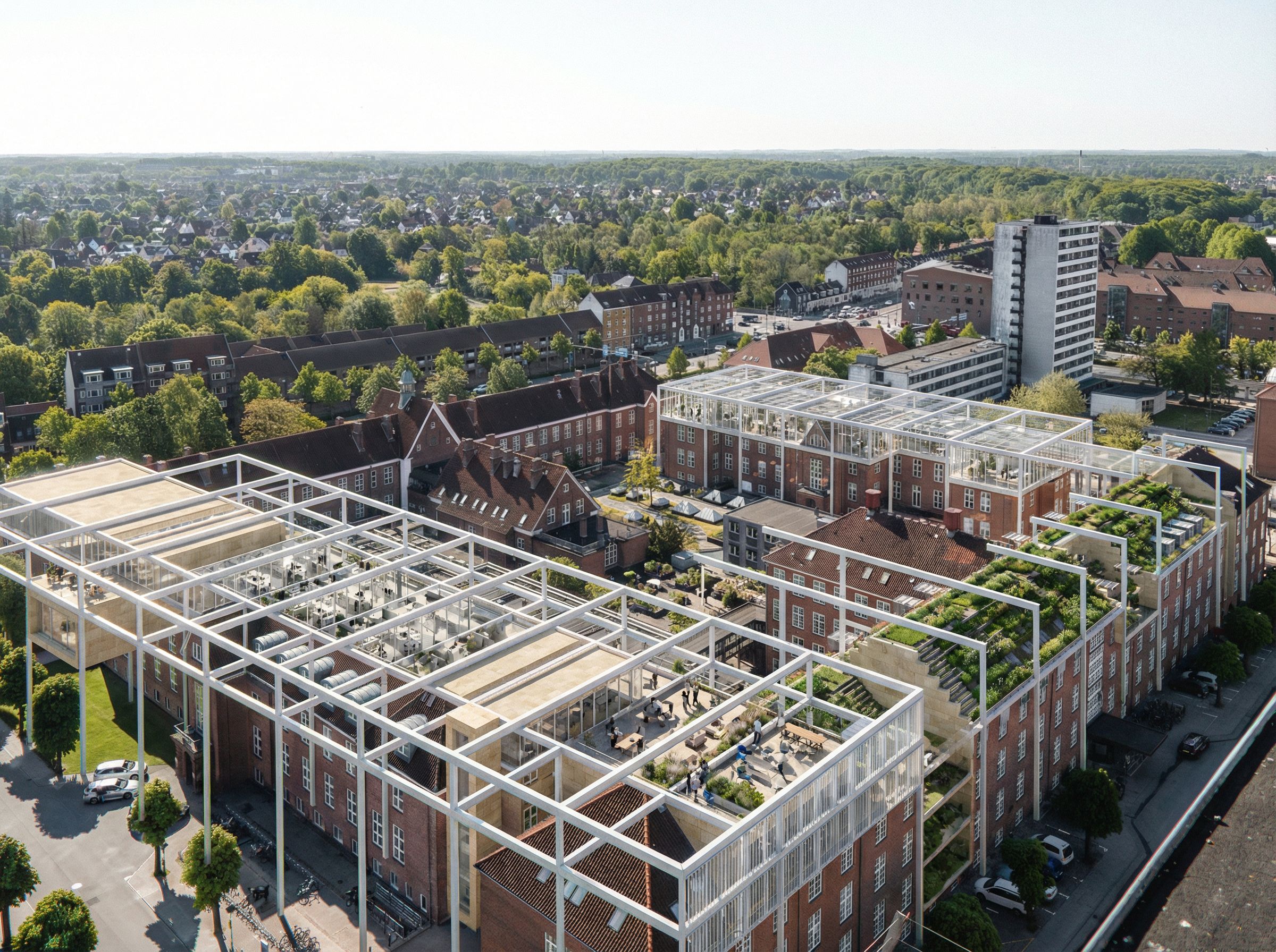 PromptInsert a white metal and glass structure composed of very thin beams and pillars in the shape of the green structure in the image onto the building in the attached photo. Add sand-colored stone-finished walls, "ONLY" on the RED volumes that descend from the roof and cut across the elevations. Add terraces with green gardens and plants on steps, "ONLY" on the blue structures in the image. Thin metal sunshades are installed both on the vertical walls of the glass structures and on the glass roofs, similar to greenhouses, as in the reference image. Create very modern and contemporary gardens within the building's courtyards, with modern squares and green areas for conversation. The upper structure above the roofs of the houses should be furnished like many offices with people and outdoor areas with people., keep exact camera angle