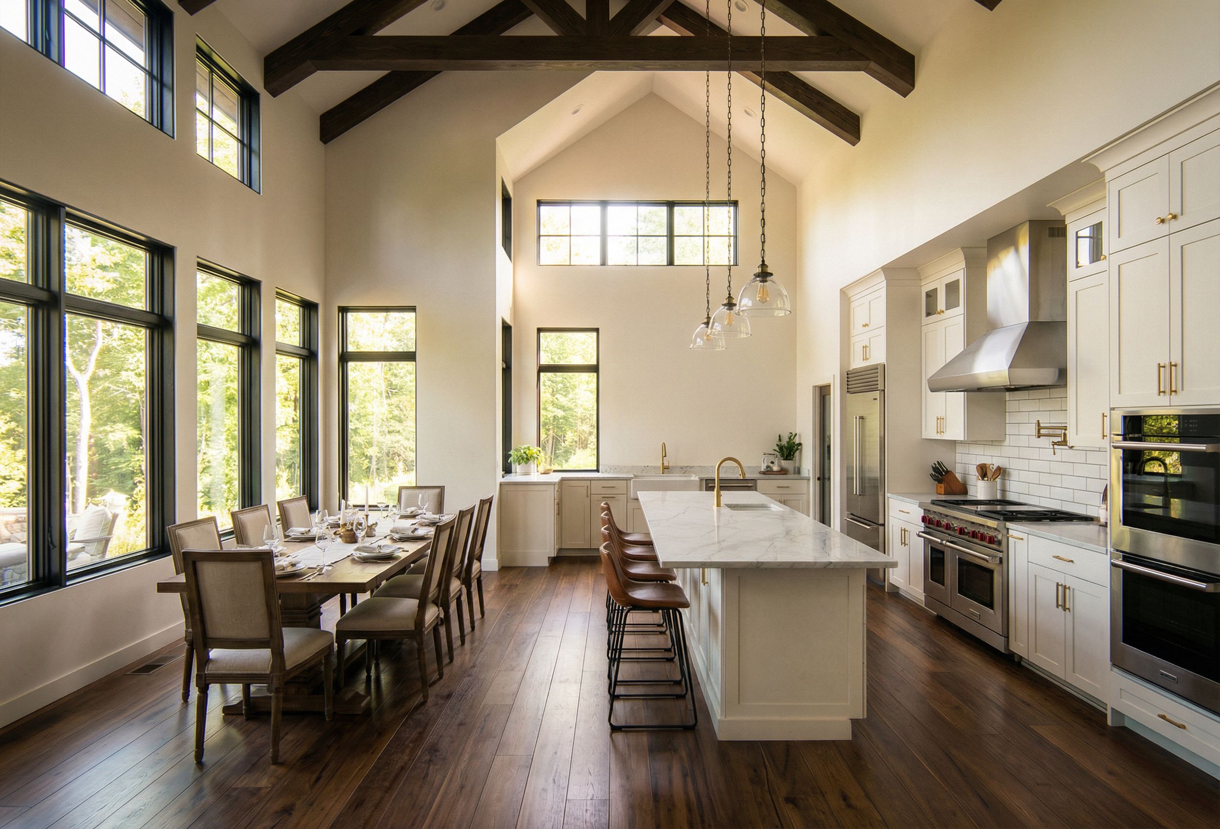 make photorealistic rendering of the interior with 8 seat dining table on the left side and parallel to 3 tall windows, kitchen on the right per Reference Image 1, keep exact camera angle