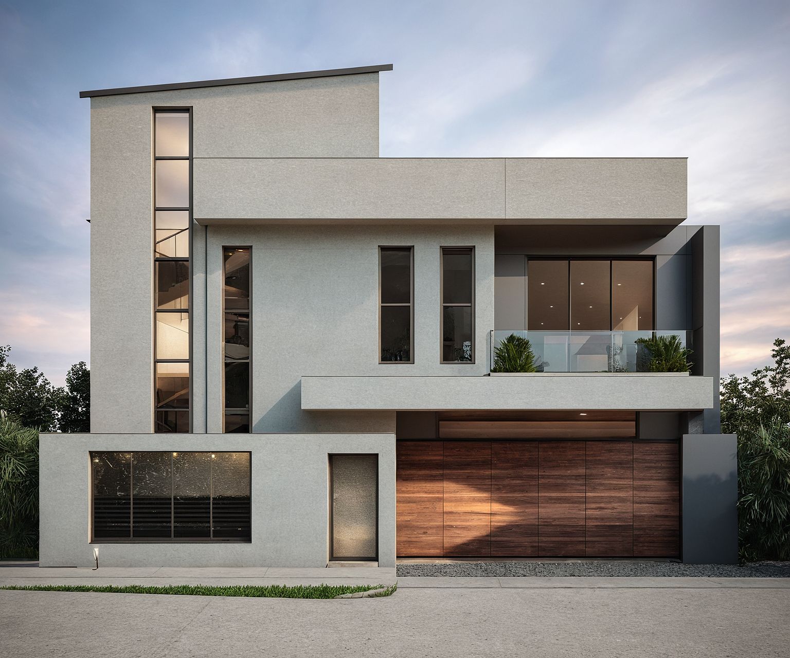 PromptCreate a nighttime render of a modern single-family house with clean, minimalist architecture. Use materials such as concrete, glass, steel, and natural stone. The color palette should include white, grey, black, and cream tones. All metal framing must be black, with no wood elements. Soft, elegant exterior lighting highlights the textures and structure. The scene is calm and harmonious, with a clear night sky and no people or vehicles.