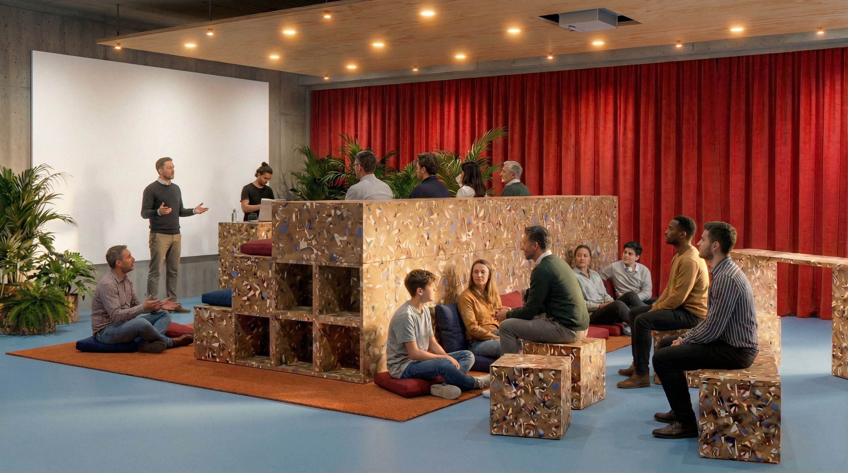 auf der tribüne sitzen menschen mit blick auf die leinwand und hören einem anderen menschen zu wie er präsentiert. hinter der leinwand arbeitet jemand an der theke und jemand sitzt auf einem sitzkissen und unterhält sich mit einem jugendlichen der neben ihm sitzt, keep exact camera angle