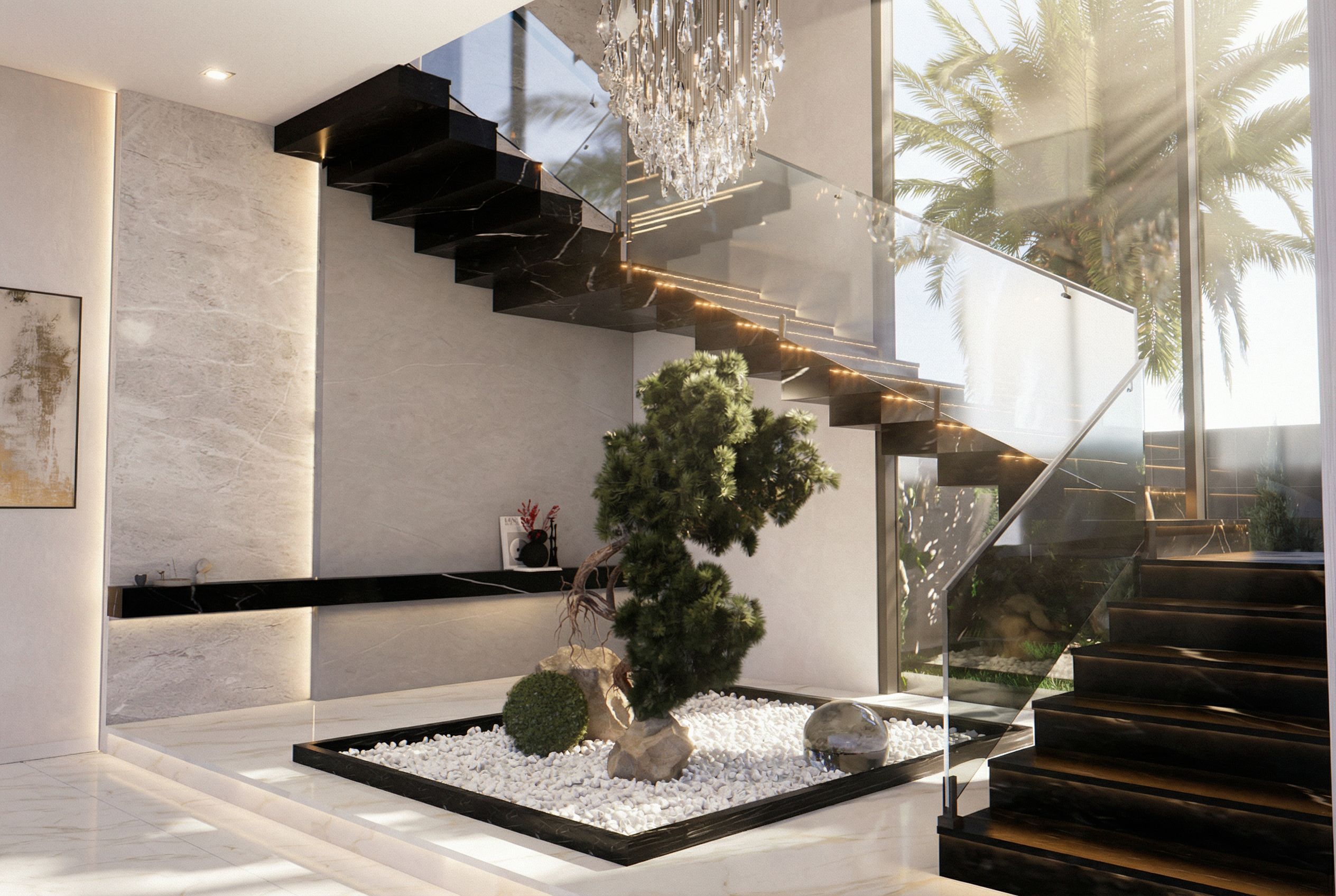 PromptEnhance the provided interior staircase render to achieve ultra-realistic cinematic daylight while strictly preserving the exact original design, layout, materials, and composition without adding, removing, or modifying anything. Do not change the architecture, furniture, or objects. Focus only on improving lighting realism and image quality. Create physically accurate sunlight entering through the window with soft cinematic sun rays and natural volumetric light beams, with realistic daylight direction and intensity. Simulate professional architectural photography lighting with accurate global illumination, natural light bounce, soft ambient shadows, and balanced HDR exposure. Keep all materials exactly the same but refine their realism (dark wood stairs, marble wall, glass railing, metal details) with clearer textures and subtle reflections. Ultra-realistic daylight, cinematic lighting, ray-traced light behavior, high dynamic range, sharp focus, professional luxury architectural visualization, 8K quality., keep exact camera angle