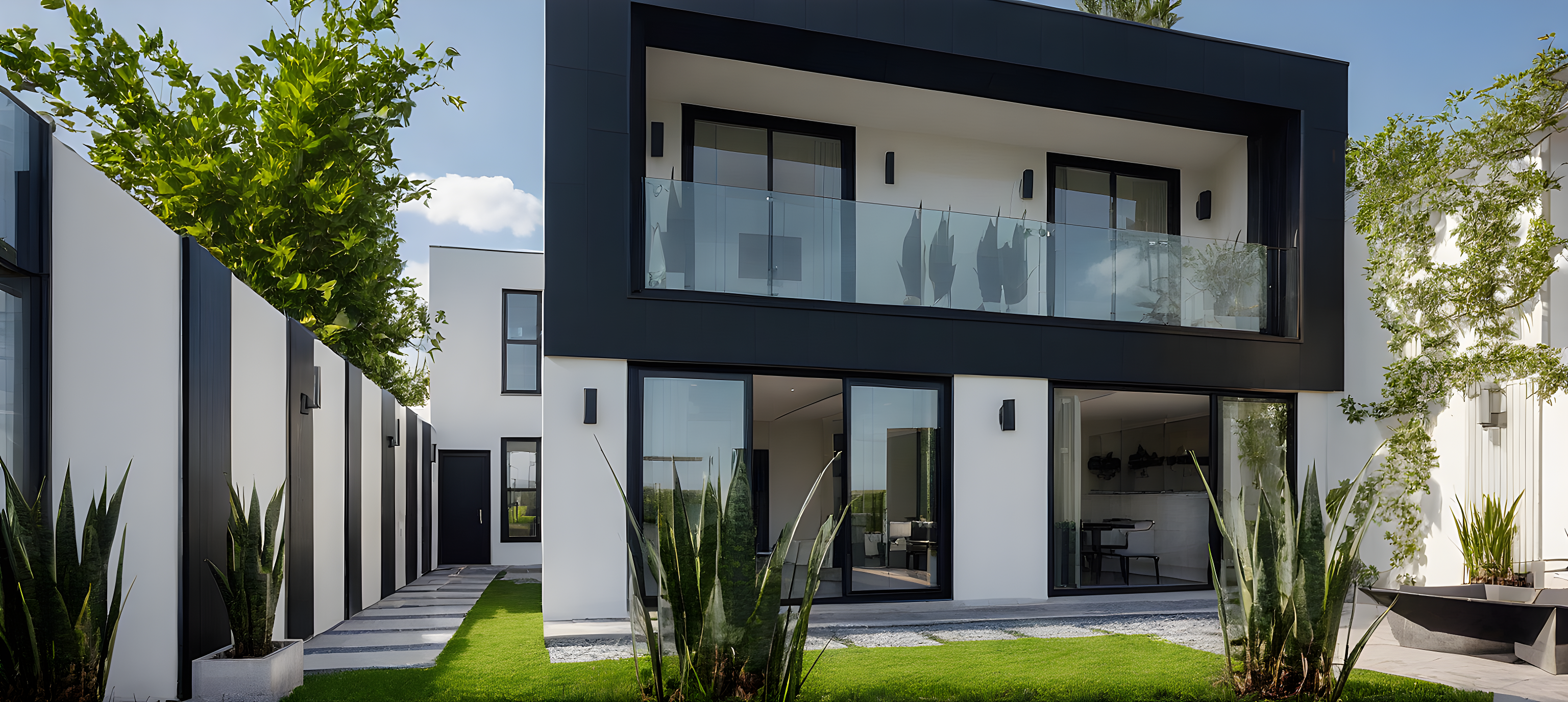 Promptimagine a stunning visual of a modern villa, clean lines, railing on balcony is made of tempered glass and stainless steel, the frame its made of dark slate and sub-frame is a black steel beam, Backyard have concrete tiles and tiny grass, realistic glass and reflections, perimetral wall is made of white plaster and wall panels, frame of windows and sliding doors are black aluminum, balcony have sansevieria pots.