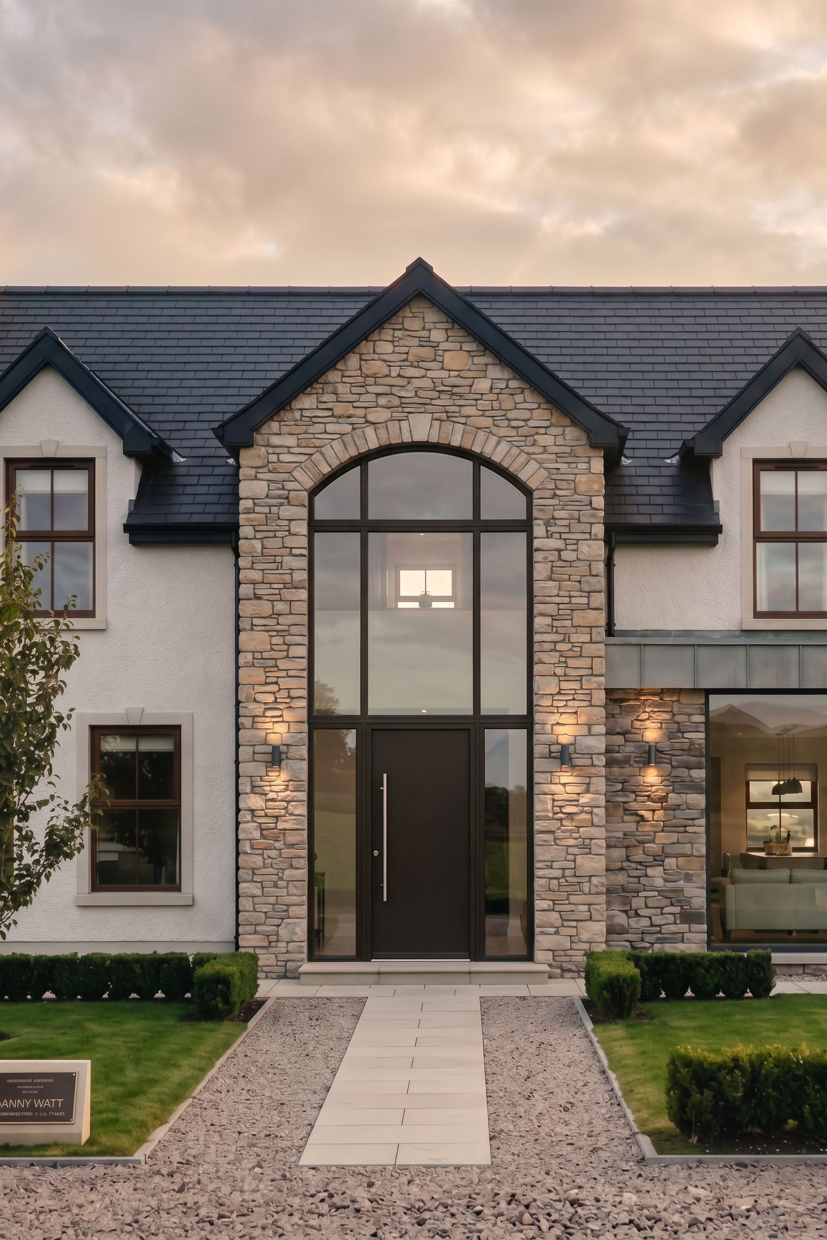 PromptCan you make the center protrusion of the primary structure the same stone as the extension and a similar door style to the reference image. Remove the quoins and straps from the corners of the building and have it smooth white plaster., keep exact camera angle