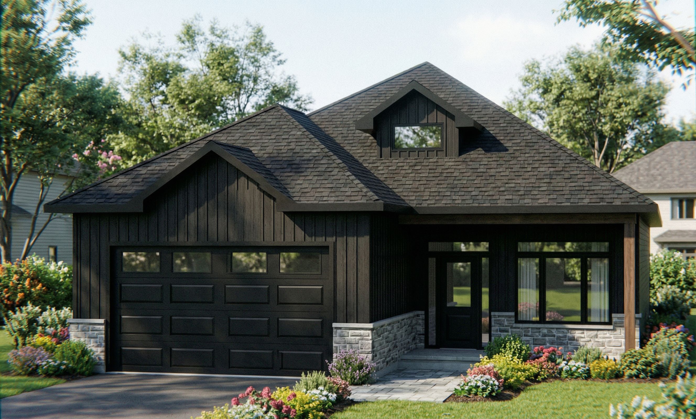 Photo of a modern single-family home with a gable roof, featuring clean lines and a front porch. The materials include black vertical wood siding with wooden accents and large glass windows. residential setting, surrounded by neatly landscaped gardens, flowers, shrubs and nearby residential buildings. Natural daylight casts soft shadows, highlighting the architectural details. Captured from a low angle lens to emphasize the height and elegant façade, framed with a focus on the entrance and garage door., keep exact camera angle