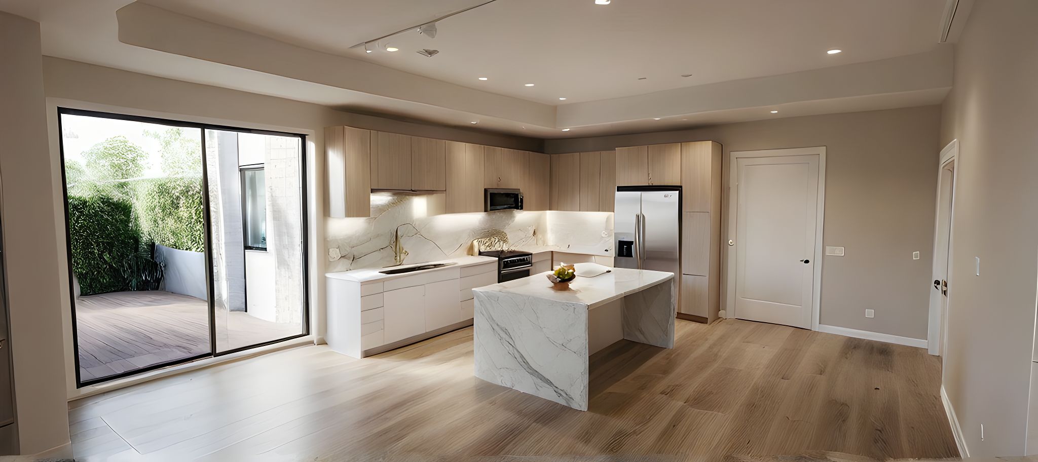 PromptPhoto of a modern kitchen, featuring sleek cabinetry and a marble island. Highlight the smooth textures of the white surfaces and the modern appliances. Surrounding urban context includes a large window revealing a of a light tunnel. Natural light pours in, casting soft shadows across the room. The perspective is slightly elevated, capturing the layout and open space effectively, using a wide-angle lens to emphasize depth and detail. its a light tunnel without a view