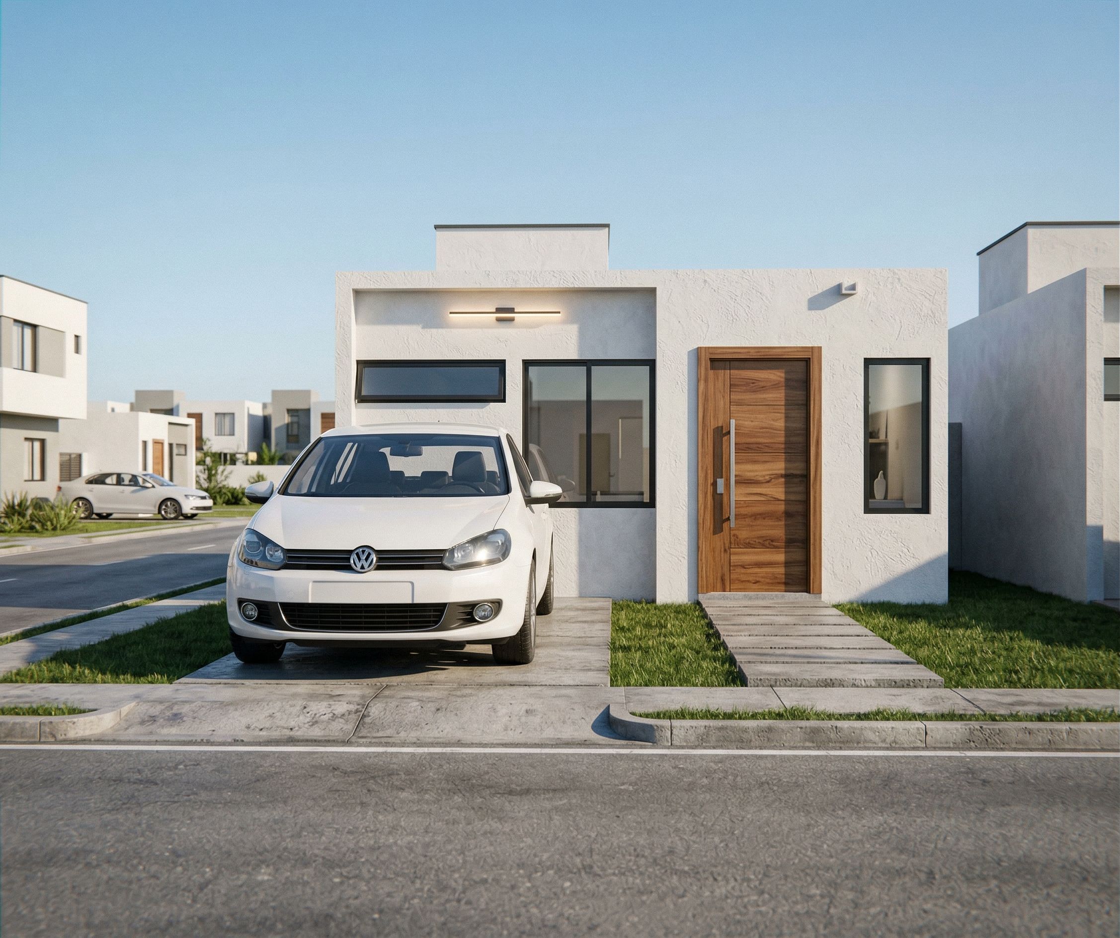 Photo of a modern single-family house, WITH NEIGHBORS WITH SIMILAR PROPERTIES. with a flat roof and minimalist design. The elegant white facade, wooden door, large windows, and textured front steps stand out. The surroundings include a driveway with a WHITE car parked on a paved area surrounded by green grass. Daylight enhances the architectural features, casting soft shadows. Captures a frontal perspective with a medium-wide lens to emphasize the building's elegant entrance and the simplicity of the surroundings.